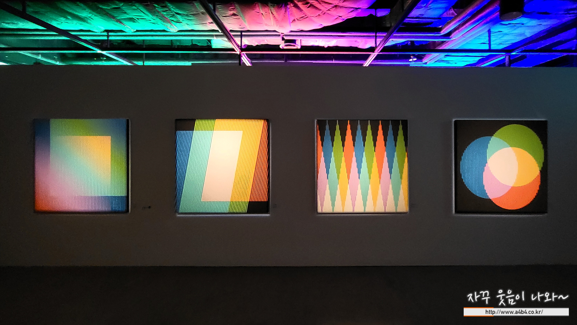 작가가 체계적으로 고안한 화면들은 빨간색, 녹색, 파란색, 검은색과 함께 불투명한 매체로 인해 표현되는 흰색만을 사용하였습니다 작가는 이 작품들을 설명하면서 '모두 비발광 매체를 사용하여 프리즘의 색상, 빛의 색상의 원리를 설명하기 때문에 다소 모순적이다.' 라고 한 있는데요, 모두 평면에서 방출된 색이 우리 눈으로 들어오는 과정에 집중하여 감상하는 작품입니다. 각 화면의 앞에서 앞, 뒤, 좌, 우로 움직이면서 그 과정에서 변화를 잘 확인해 보세요.