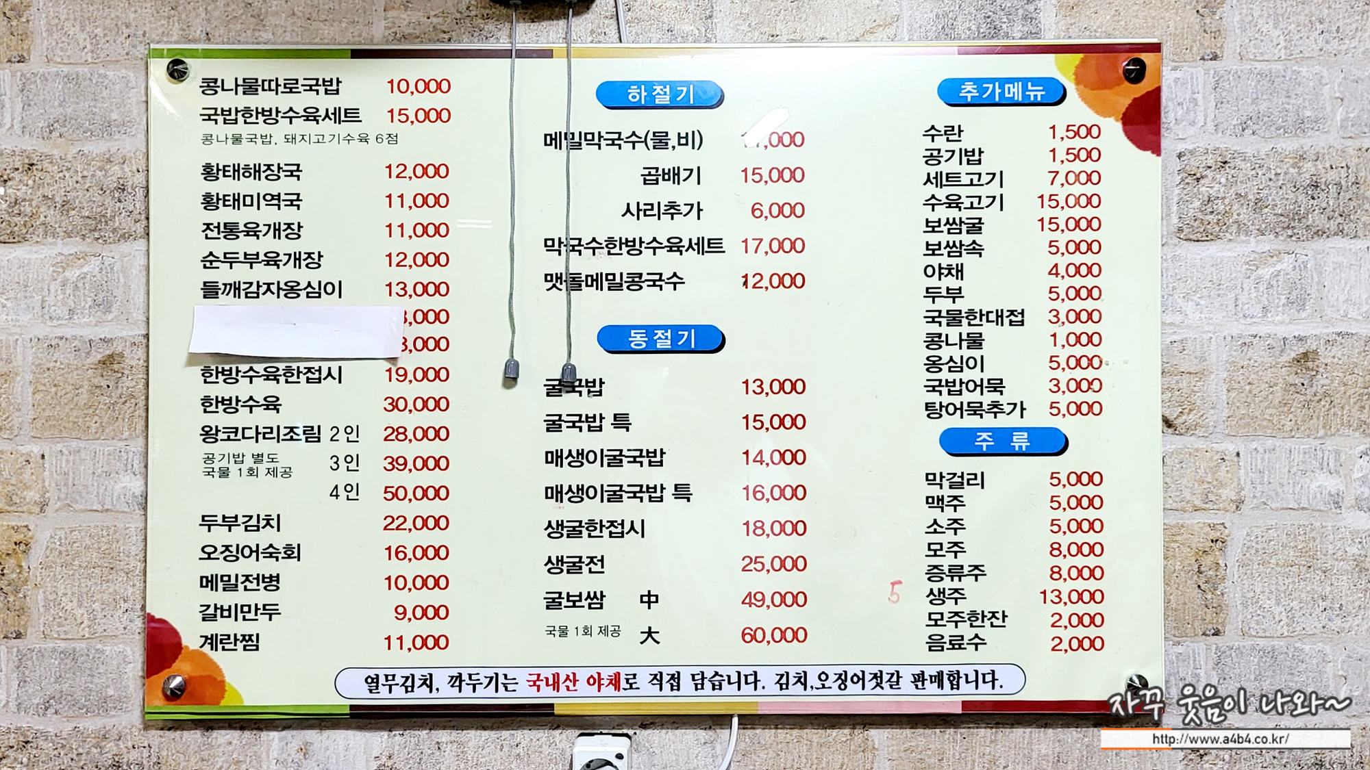 콩나물국밥과 막국수, 수육이 메인인 시강이고요. 이외에메뉴는 해장국이나 술안주 메뉴로 구성되어 있습니다. 아침 7시부터 아침손님 대상으로 영업하는 곳이네요.