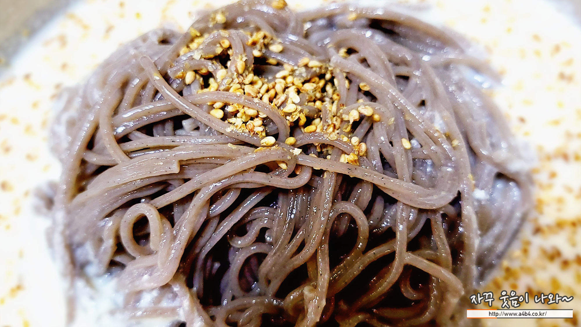 흰색 면을 생각했는데, 다시 한 번 놀랍니다. 메밀면이 나오네요.