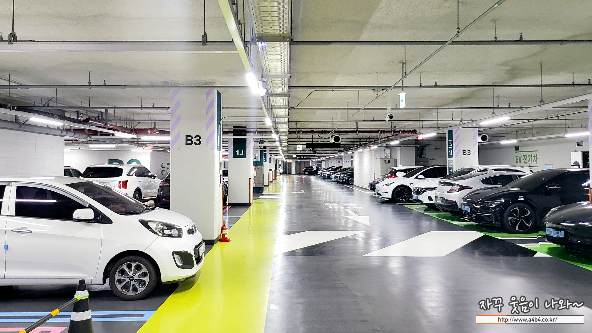 더현대서울 지하 3층 주차장 모습입니다. 매우 깨끗하게 잘 운영되고 있고요. 장애인 주차공간, 전기차 중전소, 여성전용칸 등이 운영되고 있습니다.