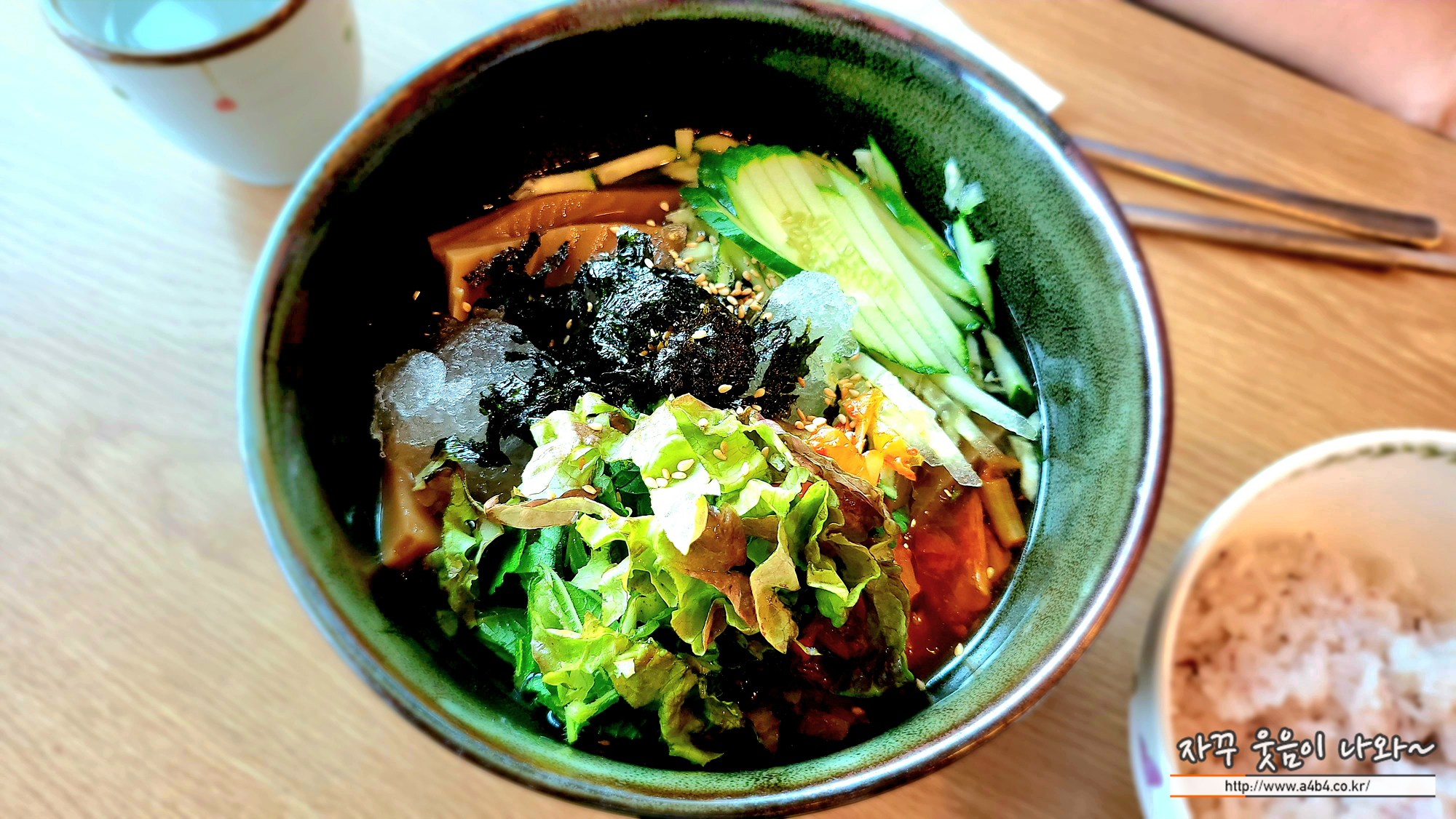 먼저 주문한 묵밥이 나옵니다. 도토리묵이 야채와 함께 새콤달콤한 국물에 같이 나옵니다. 먼저 얼음동동뜬 묵과 야채로 허기를 달래고요.