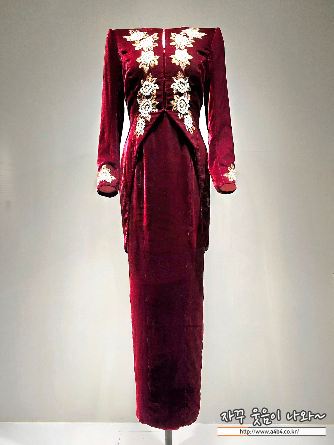 다이애나 비가 내한했을 당시청와대 공식 일정에 입은 자수 장 식 벨벳 드레스. 다이애나 비가 가장 아낀 디자이너 캐서린 워커 가 디자인했다. 러시아 왕실 예복에서 영감을 받은 이 드레스는 어 느 각도에서도 아름다워 보일 수 있도록 세심하게 제작되었다