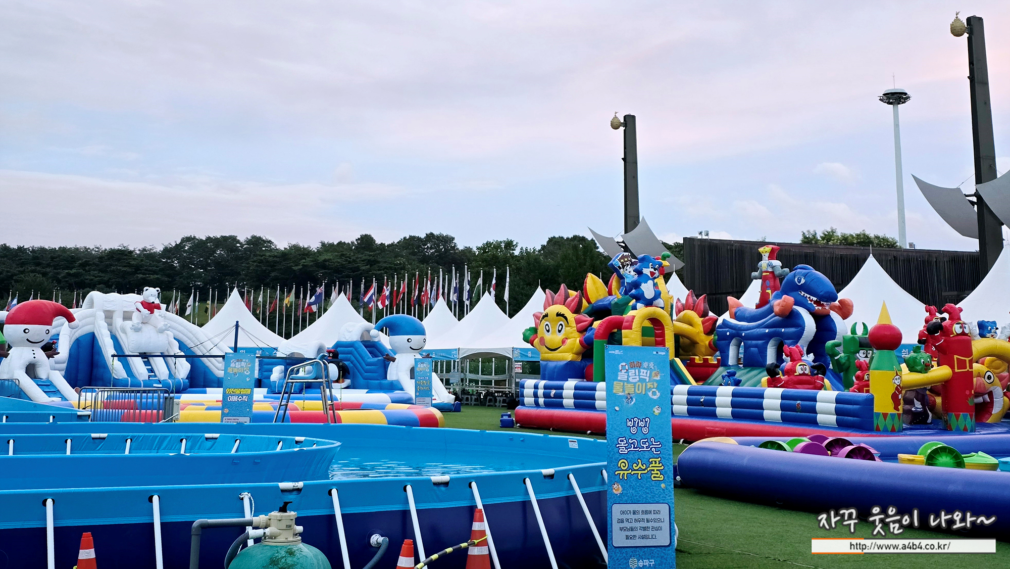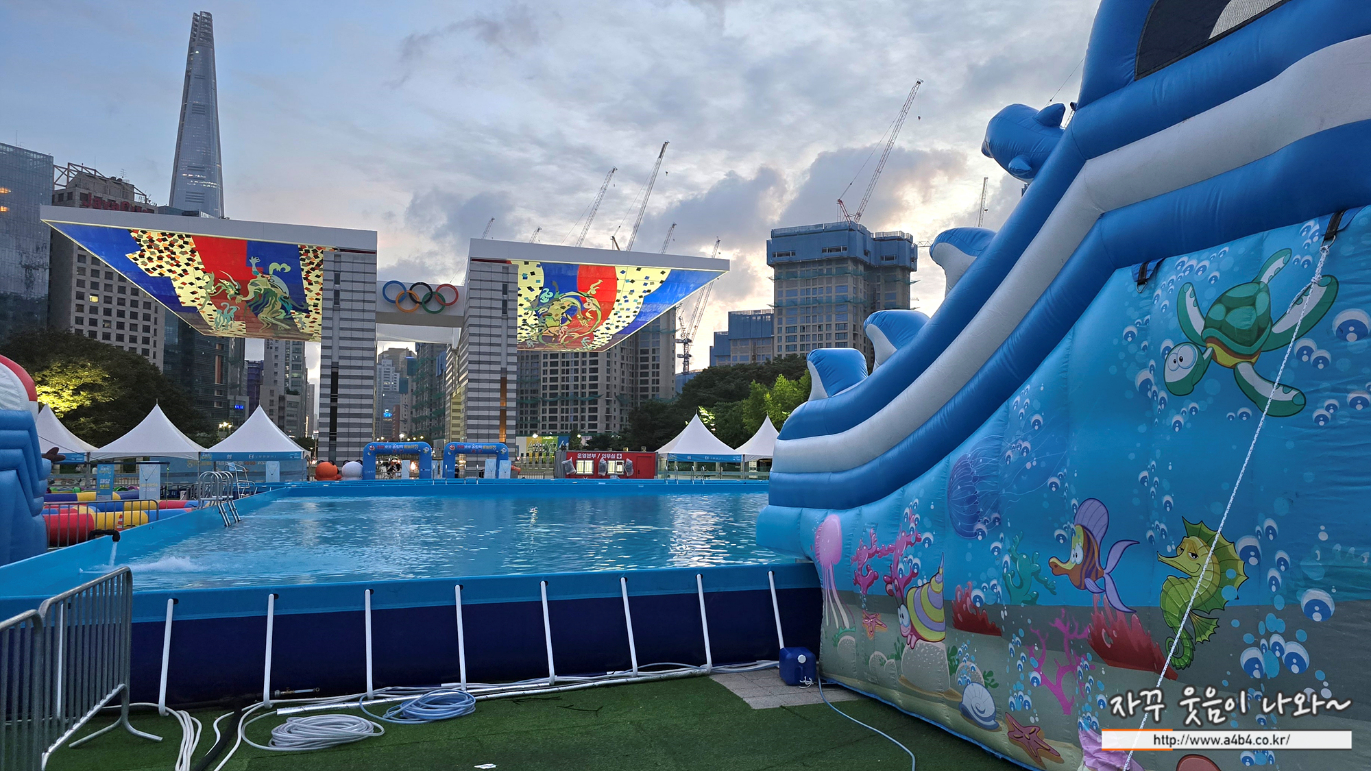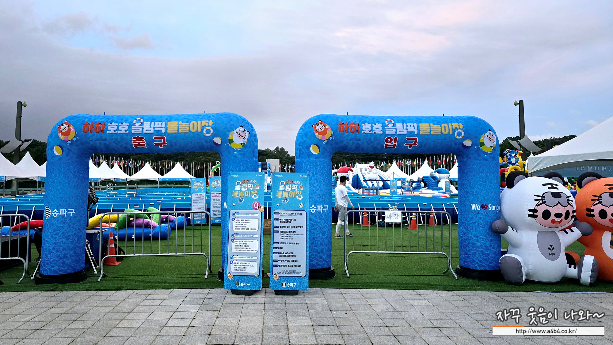 2024년 하하호호 올림픽 물놀이장은 지하철 8호선 몽촌토성역 1번 출구와 9호선 한성백제역 2번 출구에 위치한 평화의 문 뒷편 평화의 광장에 설치되어 있습니다. 1,550㎡ 규모로 작년 650㎡ 규모에서 900㎡가 증가한 이제는 물놀이장이라고 부르기에는 너무 크고 워터파크라고 부르기에는 약간 작은 규모의 미취학 어린이 대상의 물놀이장이 오픈 했네요.