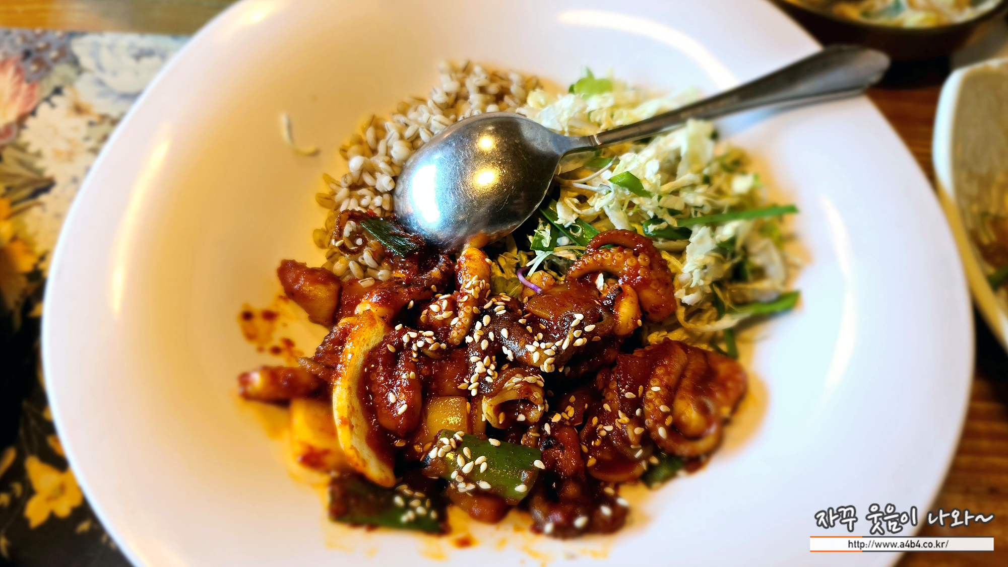 이름은 불주꾸미라고 있지만 그렇게 맵지는 않습니다. 주꾸미와 보리밥의 톡톡 거리는 식감이 좋네요. 양은 많지 않고요 (뒤에 나올 음식이 있어 많을 필요도 없음)