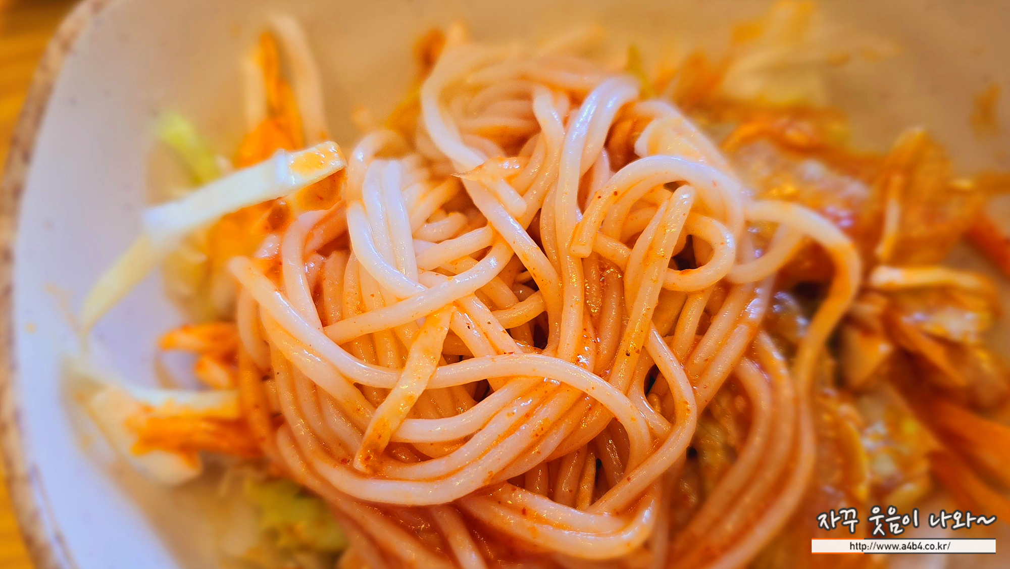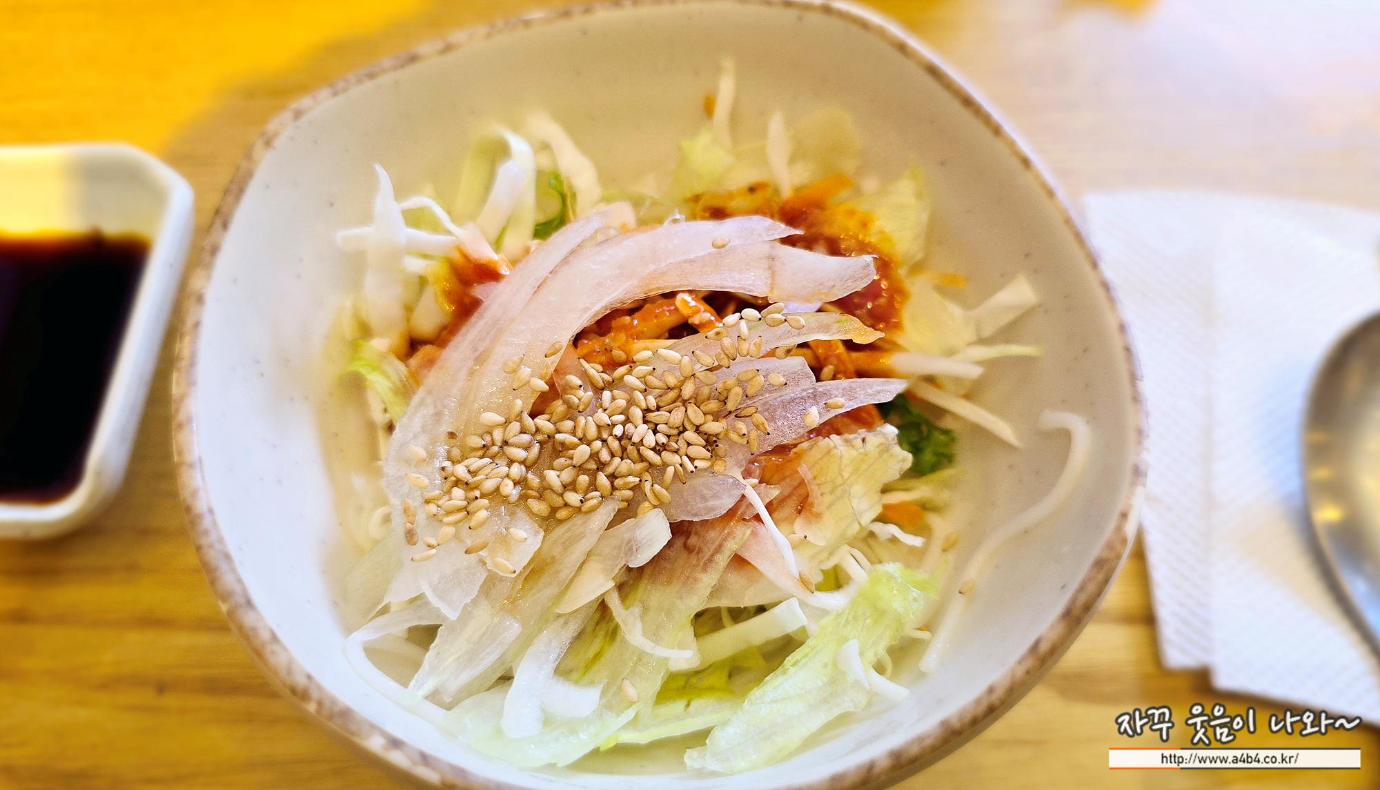 샐러드는 그냥 샐러드로 생각했는데. 밑에 소면이 새콤매콤달콤하게 양념되어 들어 있습니다.