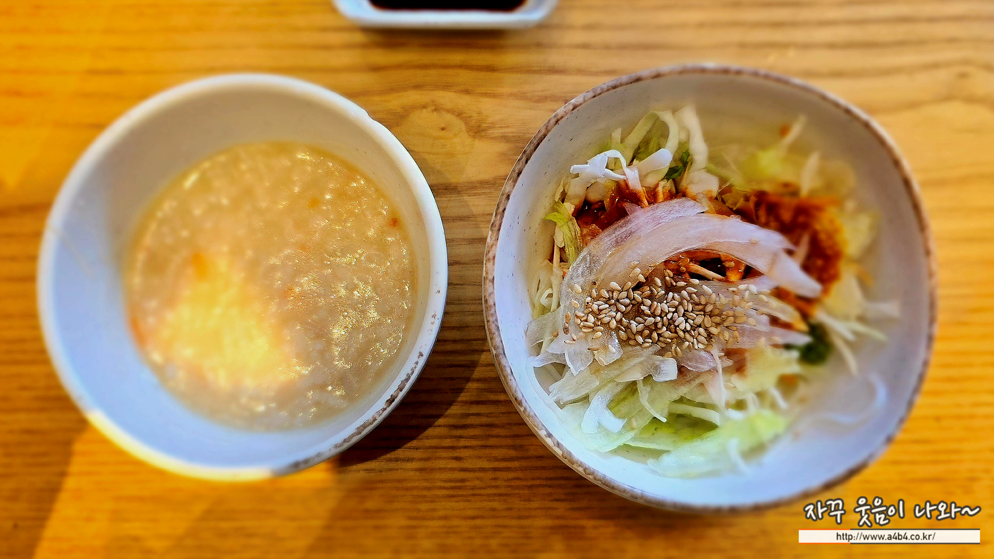 주문하면 1인당 죽과 샐러드가 나옵니다. 락교, 초생강, 꼬들 단무지 나오네요.