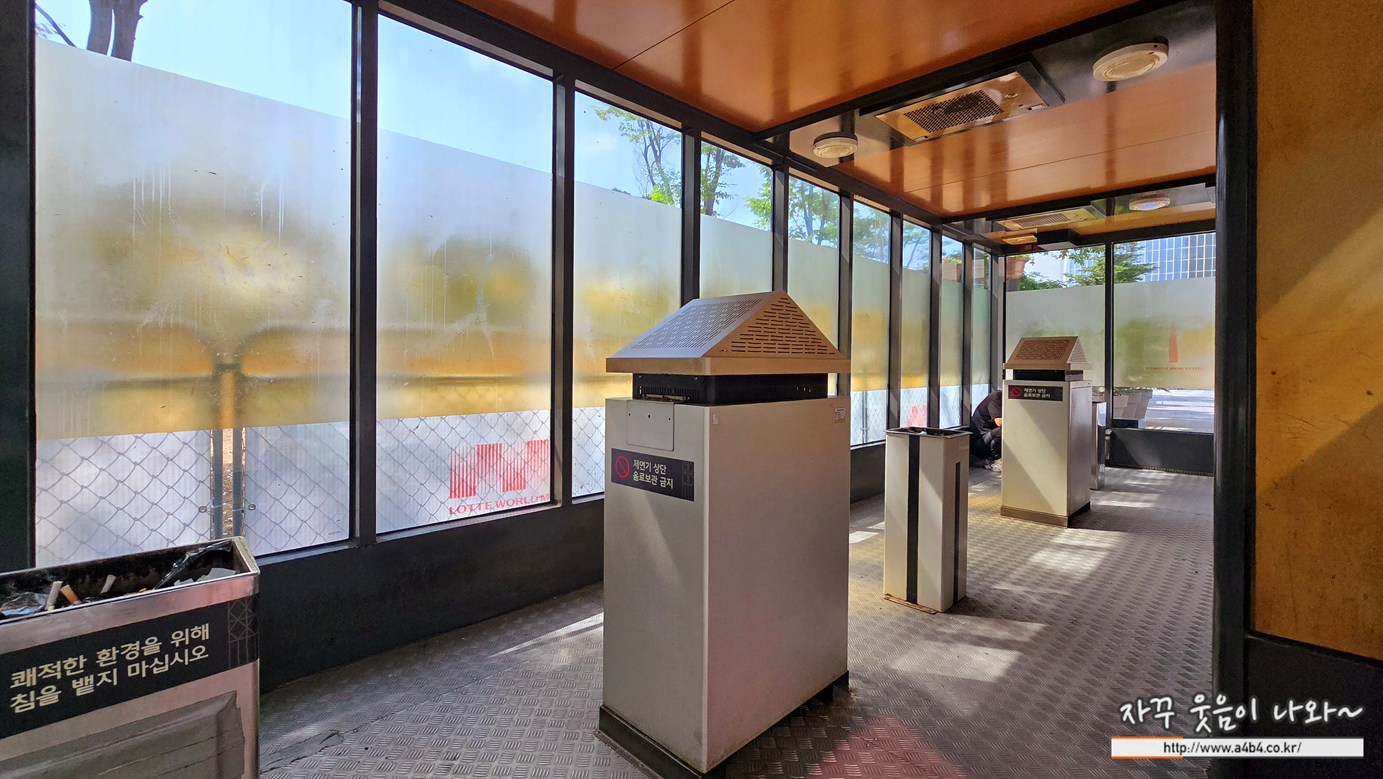 롯데월드몰 흡연실 (야외) 실내입니다. 에어컨과 재떨이, 담매연기를 빨아들이는 재연기가 마련되어 있으며, 의자나 테이블 등은 준비되어 있지 않습니다.