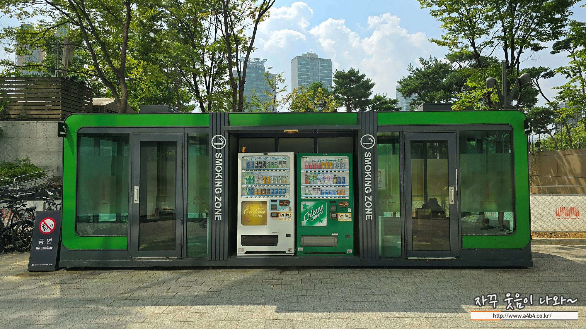 먼저 야외 흡연실입니다. 야외 흡연실은 롯데월드몰 뒷편에 위치해 있는데요. 바로 송파구청과 KT타워가 위치한 끝쪽 부분에 위치해 있습니다. 석촌호수 방향 가장 끝 뒷문으로 나오시면 롯데월드몰 흡연실을 찾을 수 있습니다. (위 사진의 무지가 있는 부분...)
