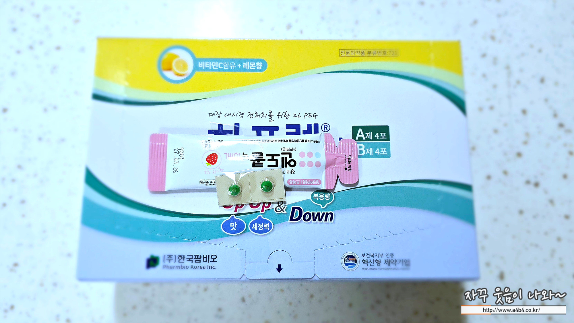 무색의 레몬향이 첨가된 화학약품입니다. 주 성분은 폴리에틸렌글리콜 인데요. 좀 더 강한 화학적인 변비약인 것 같습니다. B제는 아스코르브산이 주된 성분으로 보이는데, 화학적인 비타민 C 같네요.