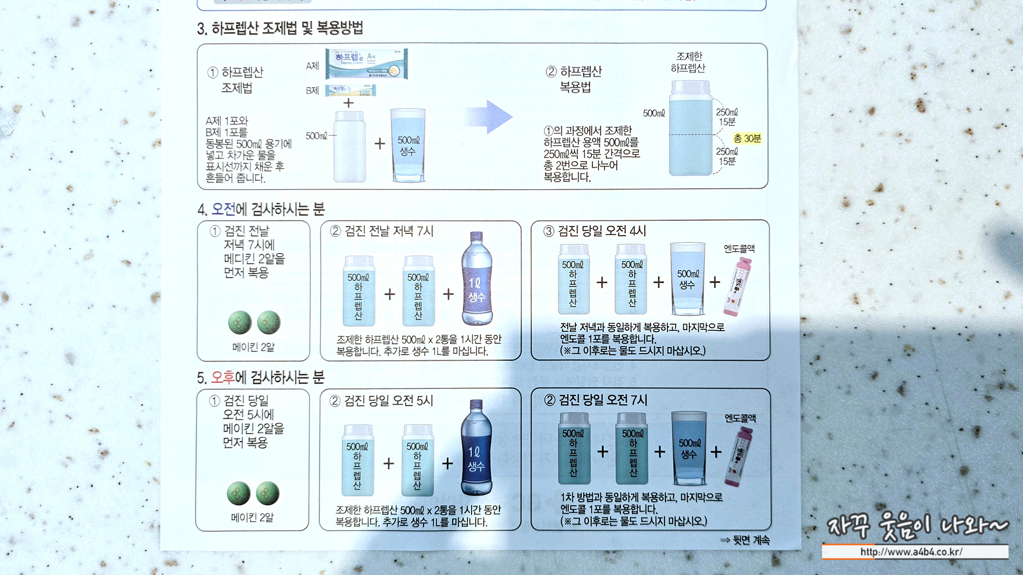 7시에 약과 함께 1리터의 물, 추가로 1리터 생수 총 2리터의 물을 먹어야 하고요. 새벽 4시에 일어나서 약과 함께 1.5 리터의 물을 먹어야 합니다. 옛날에 비해서는 상당히 먹는 양이 줄어들기는 했지만 수면 대장내시경 약 복용은 고문 수준입니다.