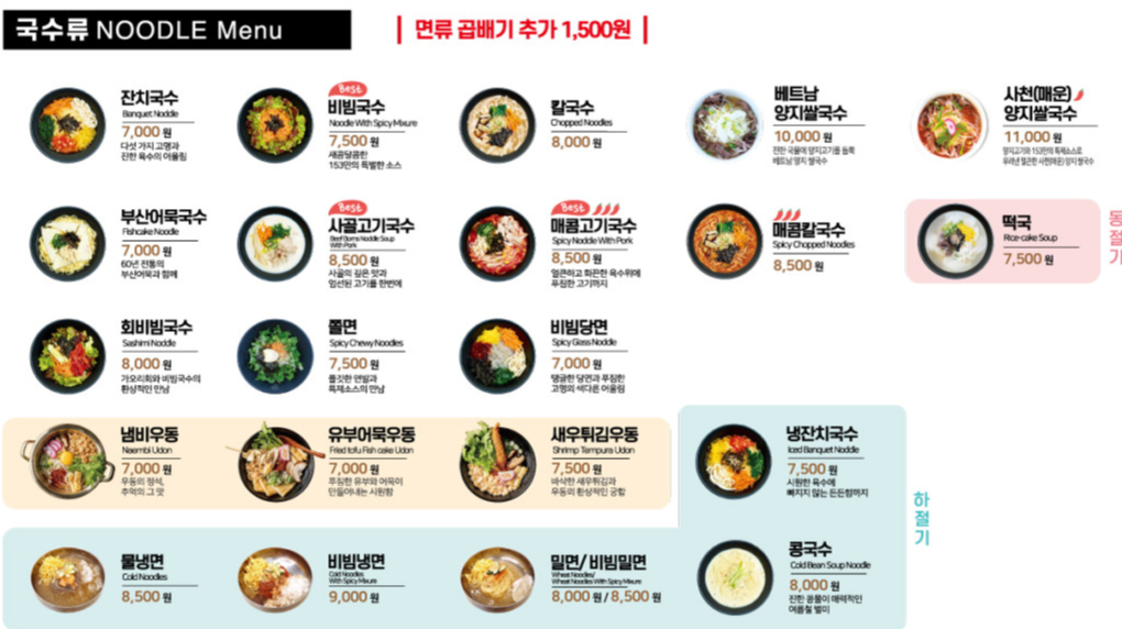 다양한 국수류는 물론 칼국수, 베트남 쌀국수, 사천 양지쌀국수, 떡국, 콩국수, 냉면, 밀면 등 면요리 대부분을 만나볼 수 있습니다.