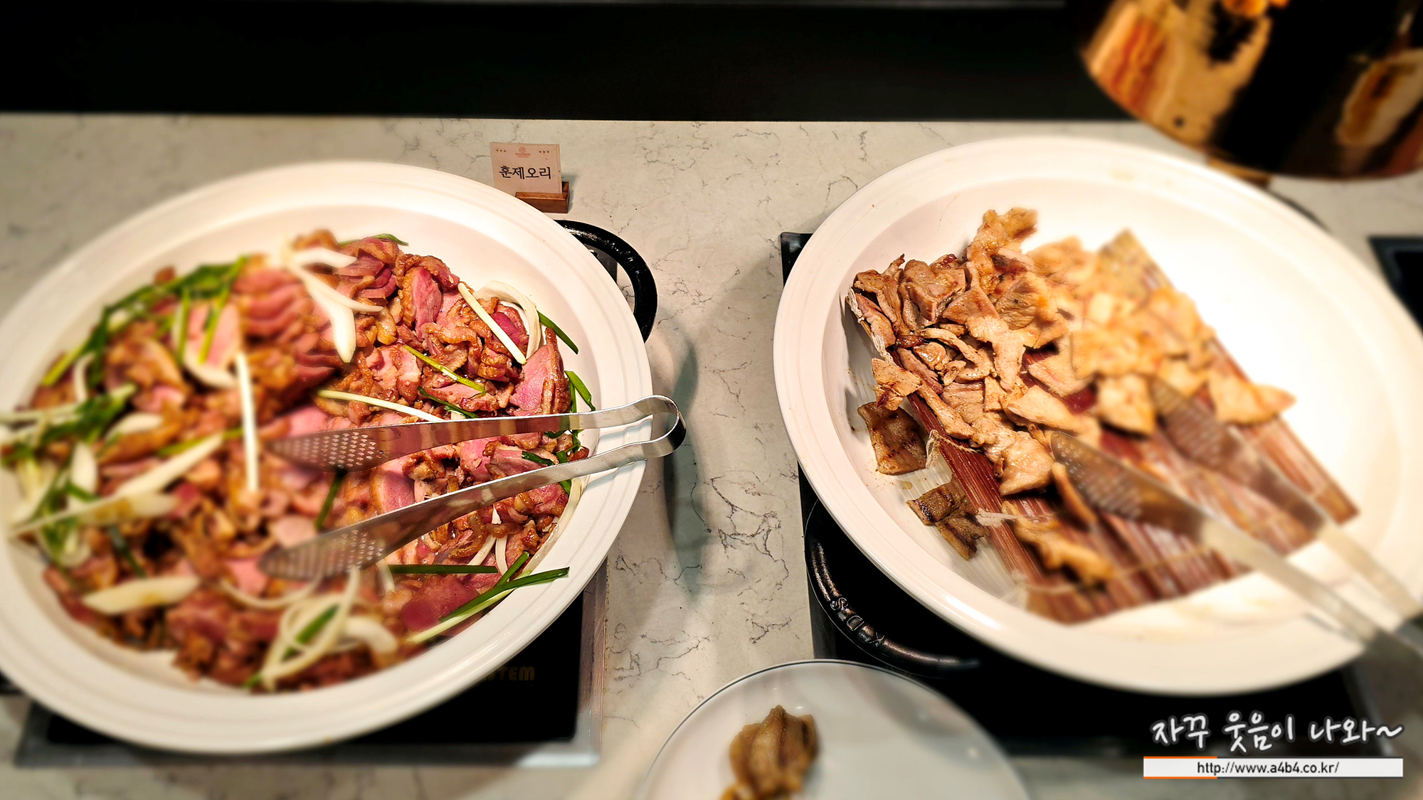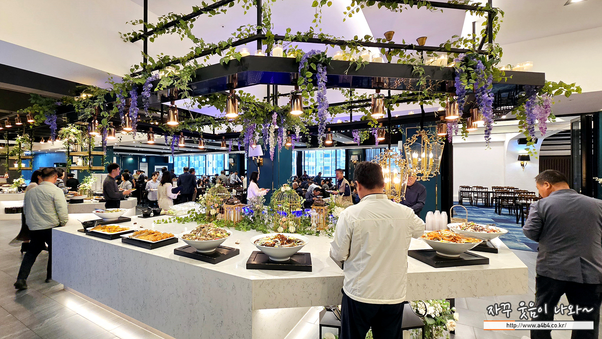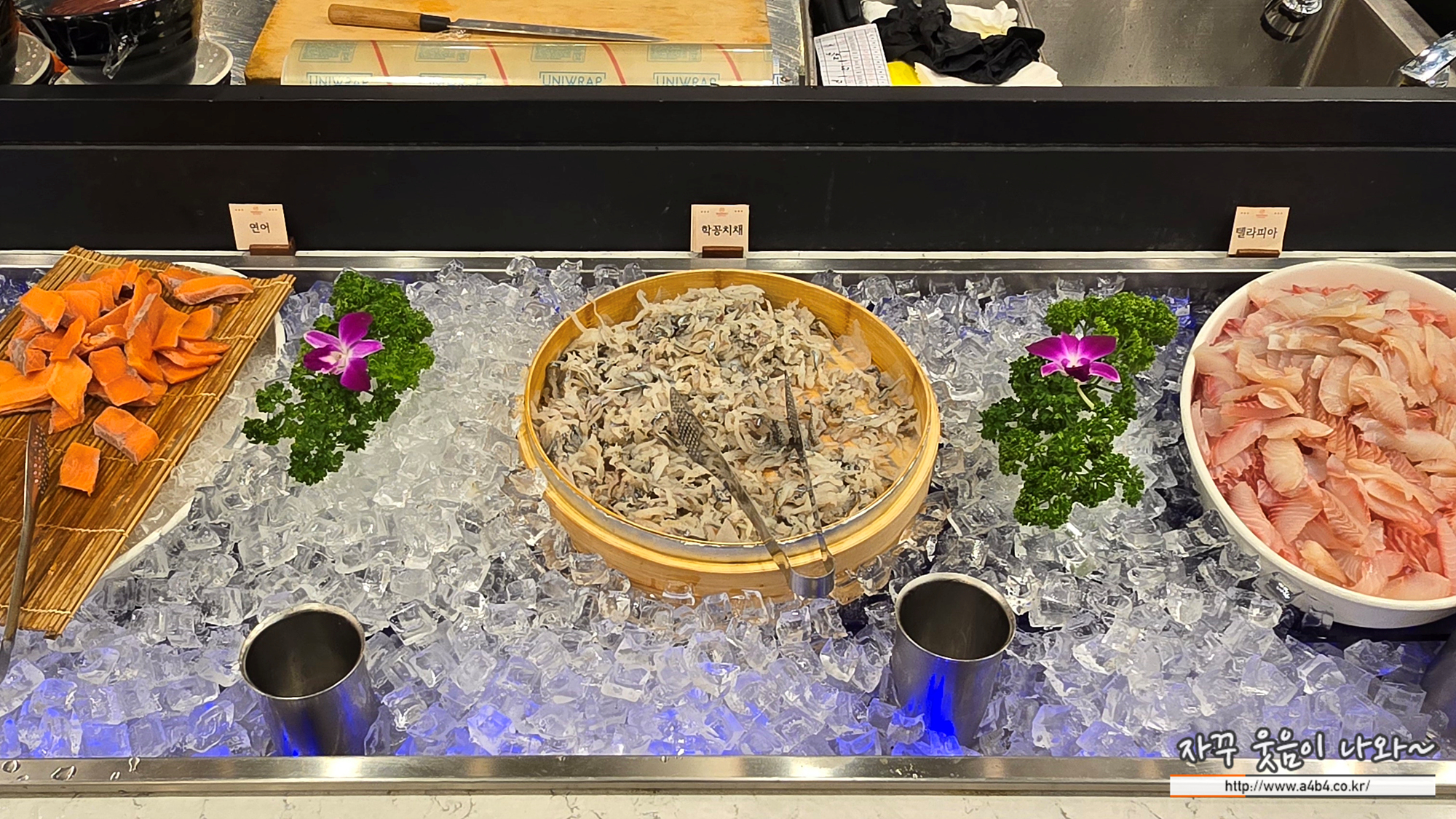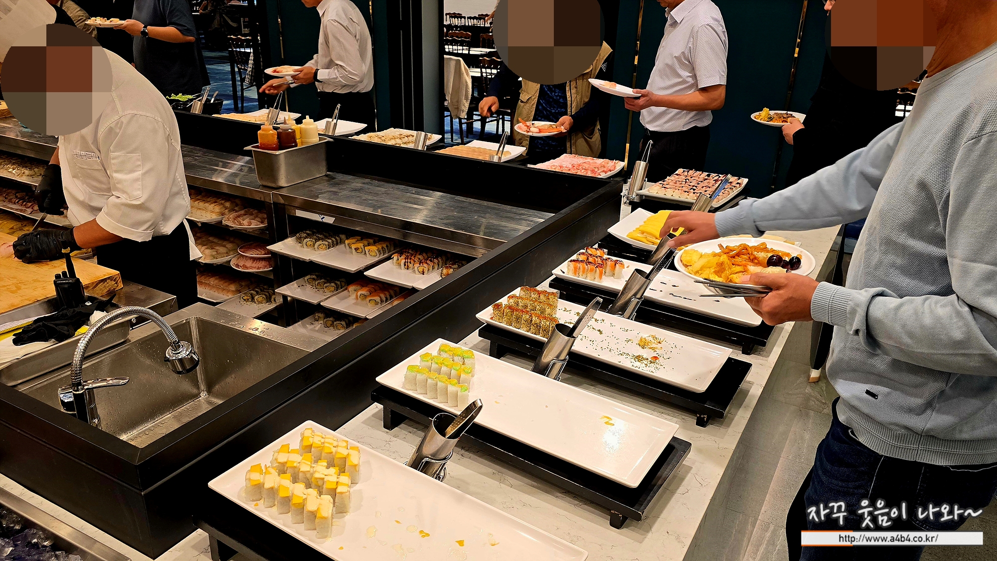뷔페 식사는 구역별로 정리되어 있고요. 고기류와 튀김류가 나오는 메인구역과 초밥 등이 있는 해산물 구역, 샐러드와 과일이있는 구역, 한식요리가 있는 구역등으로 구분되어 있습니다.