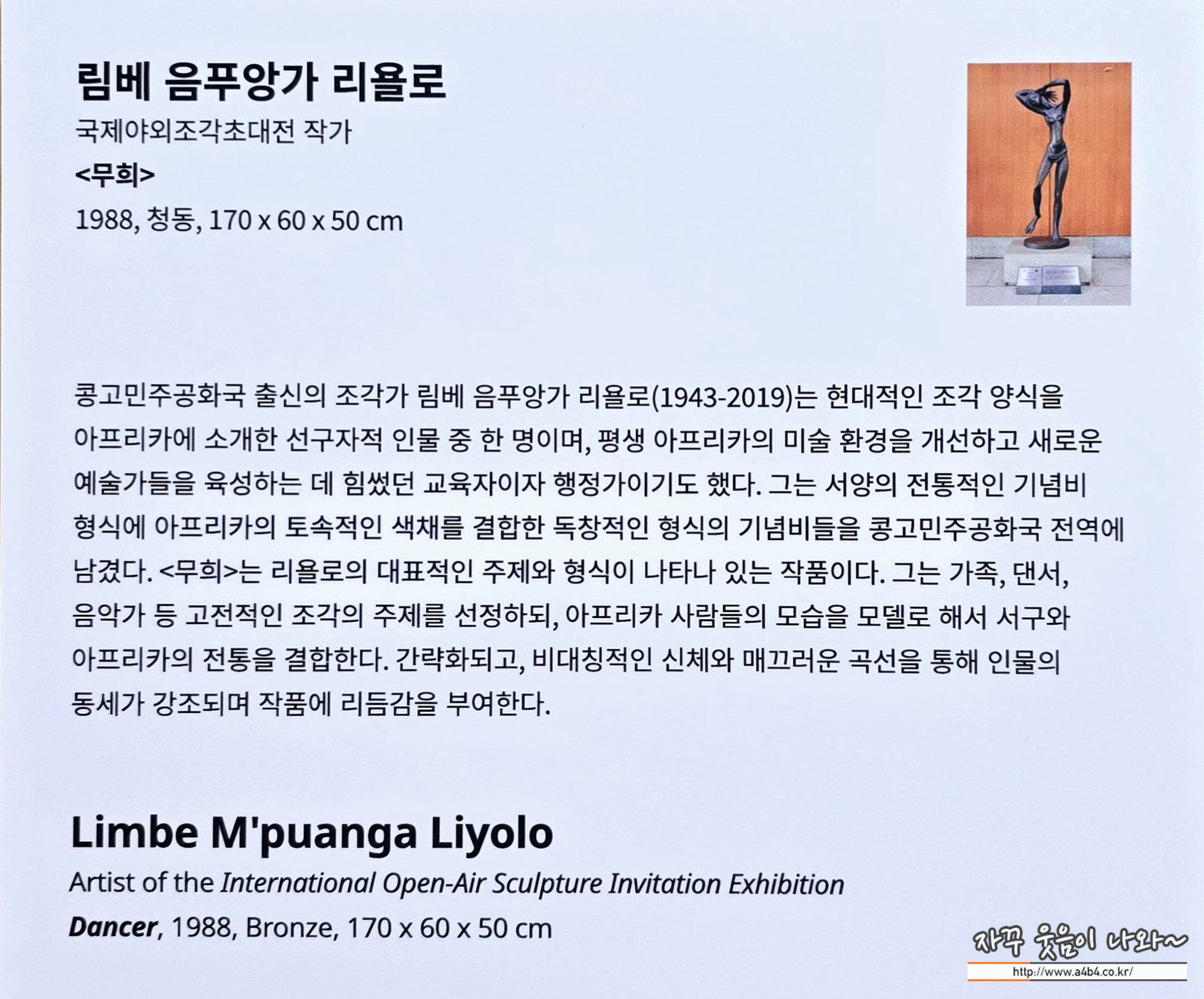 콩고민주공화국 출신의 조각가 림베 음푸앙가 리욜로(1943-2019)는 현대적인 조각 양식을 아프리카에 소개한 선구자적 인물 중한 명이며, 평생 아프리카의 미술 환경을 개선하고 새로운 예술가들을 육성하는 데 힘썼던 교육자이자 행정가이기도 했다. 그는 서양의 전통적인 기념비 형식에 아프리카의 토속적인 색채를 결합한 독창적인 형식의 기념비들을 콩고민주공화국 전역에 남겼다. <무희>는 리을로의 대표적인 주제와 형식이 나타나 있는 작품이다.