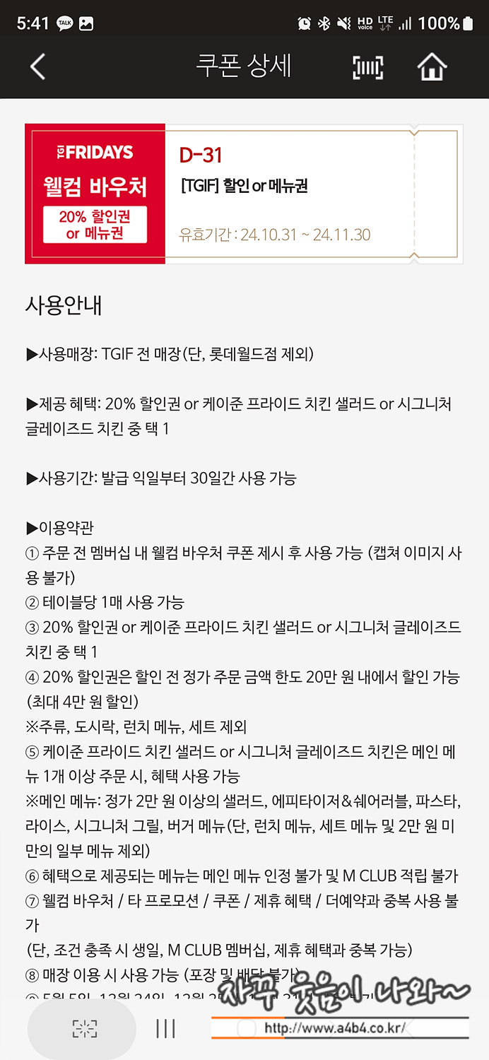 TGIF 할인쿠폰은 음료 이용권과 20% 할인권 또는 케이준 프라이드 치킨 샐러드 또는 시그니처 글레이즈드 치킨 중 선핵할 수 있는데요. 20% 할인쿠폰은 담품 정식메뉴 20,000원 이상 주문해야 할인 적용이 가능합니다.