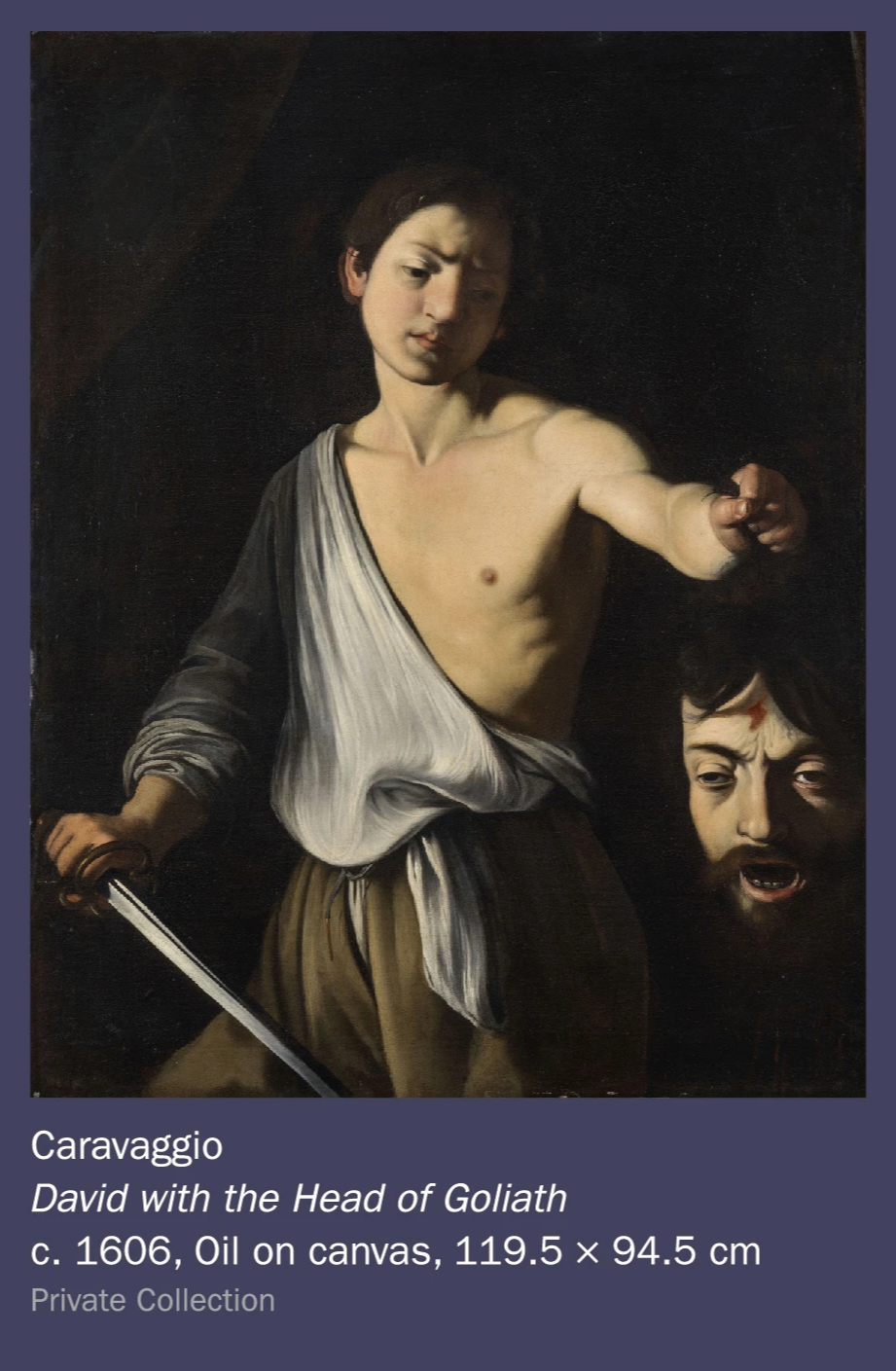 이번 빛의 거장 카라바조 & 바로크의 얼굴들 전시회에서 만날 수 있는 카라바조의 작품 중 하나입니다. 이 작품에 많은 이야기가 있지만 목이 잘린 골리앗의 얼굴은 바로 카라바조 자신입니다. 더욱도 흥미로운 부분은 다윗의 얼굴도 젋은시절 카라바조 자신의 얼굴이라고 합니다.