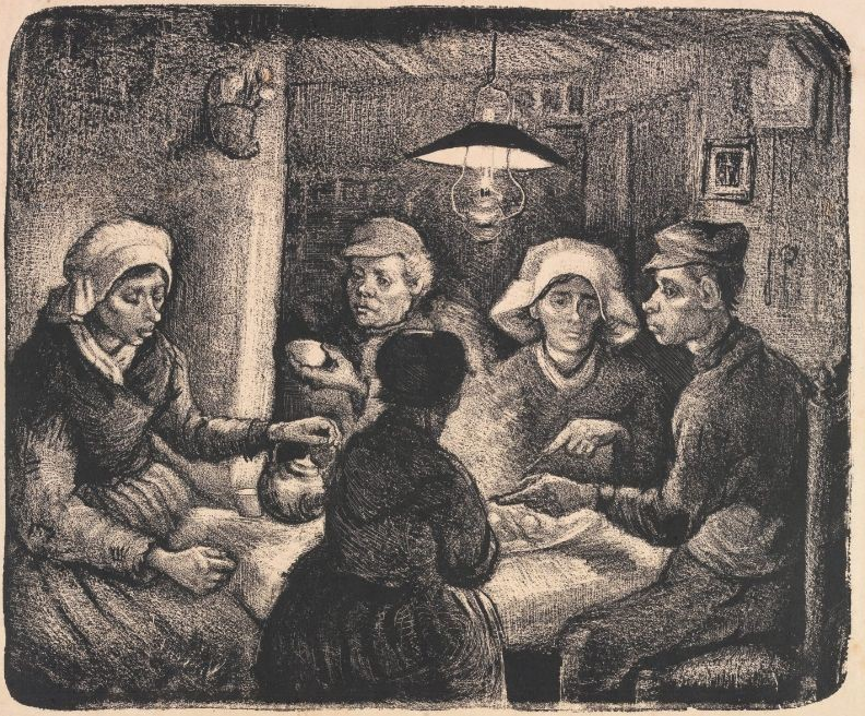 반 고흐의 대표작 중 하나인 감자먹는 사람들은 반 고흐 네델란드 시기 작품으로 초기 작품에 속합니다. 이번 전시회에서는 석판화 작품이 소개되는데요. 이 외에도 유화 작품등이 알려 있습니다.