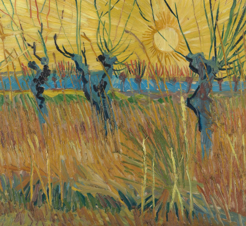 열렬한 기질 그는 감정을 표현하기 위해 색을 사용할 수 있다는 것을 깨닫게 됩니다. 색상은 '지역적으로 진실'할 필요는 없지만 '어떤 감정, 열렬한 기질을 암시'해야 합니다. 이 풍경에서 그는 강렬한 색상 대비를 사용하여 자연의 인상적인 풍부함을 강조합니다. 밝은 색상 반 고흐는 3월 해질녘에 나무에 새 잎이 돋아나는 폴라드 버드나무를 그립니다. 그는 밝은 노란색, 주황색, 빨간색 및 파란색 색상을 사용하고 길고 짧은 불규칙한 붓놀림을 번갈아 가며 자신감 있게 적용합니다.