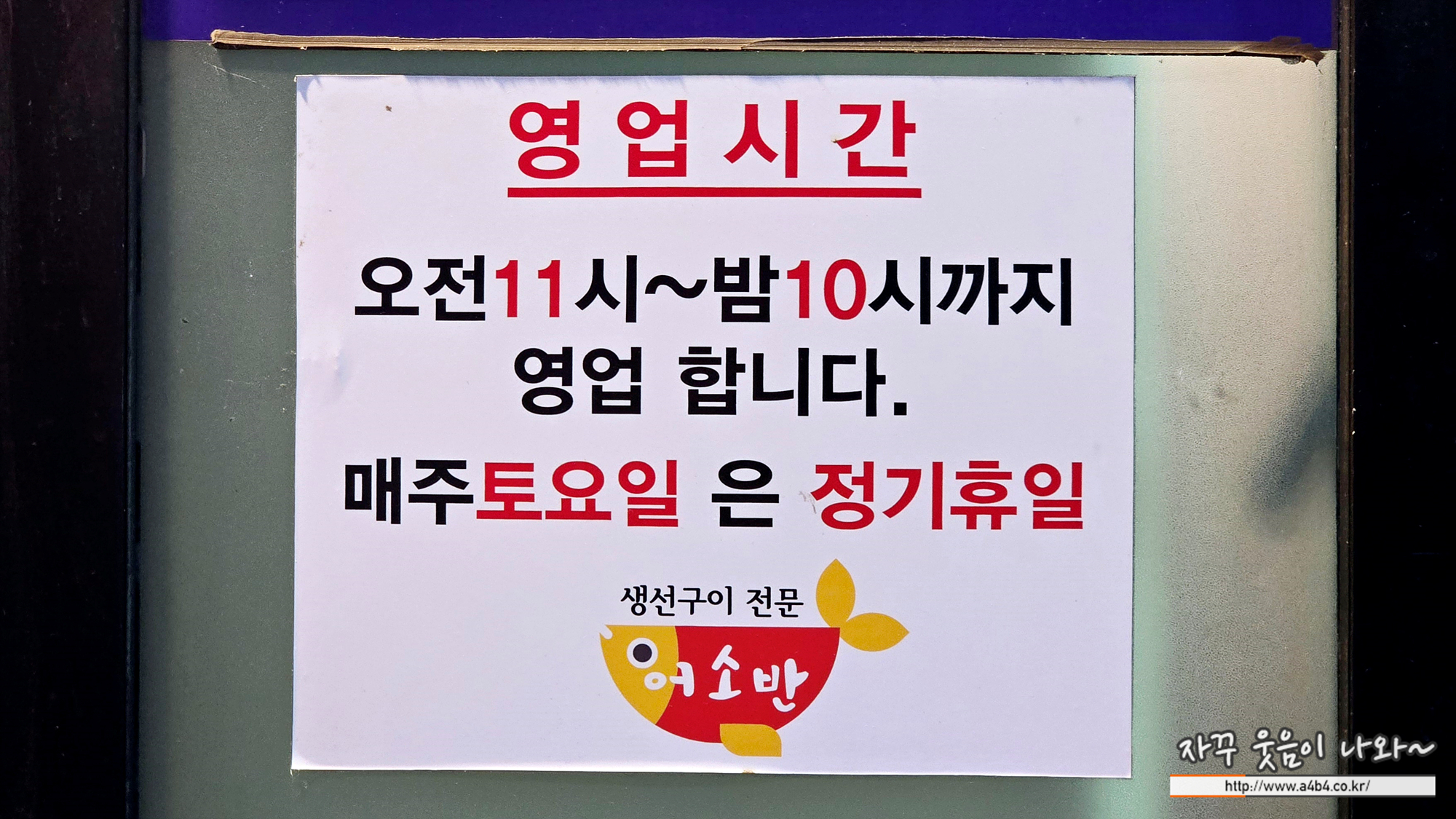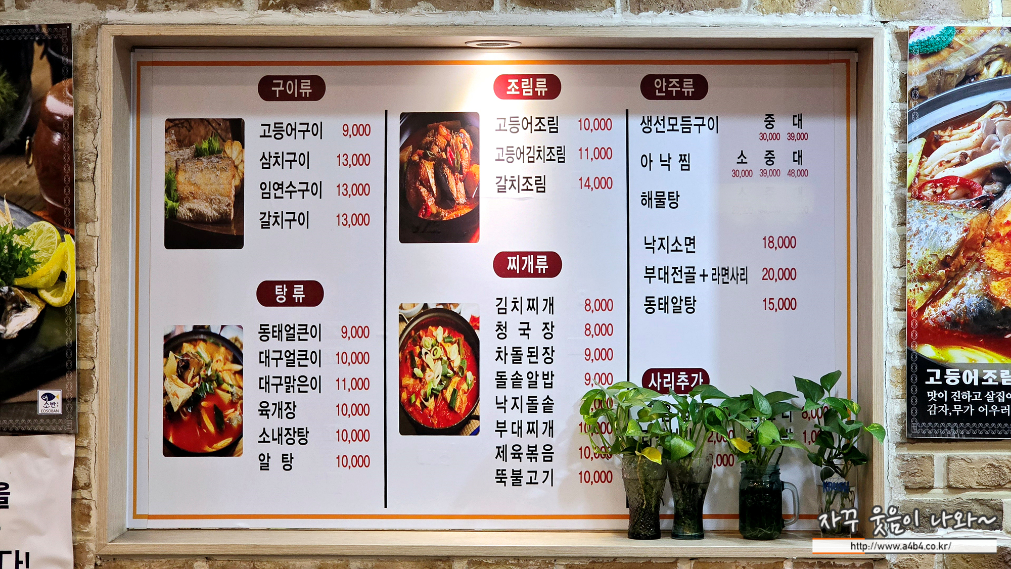 어소반 메뉴판입니다. 고등어구이, 갈치구이 등 생선구이는 9,000~13,000원 가격에 만나볼 수 있고요. 동태얼큰이 대구얼큰이, 알탕 등 탕류는 10,000원 전후 가격입니다. 고등어조림과 갈치조림 등 조림류와 찌개류도 준비되어 있습니다. 또한 저녁 술손님을 위한 안주류도 저렴한 가격에 만나볼 수 있습니다.