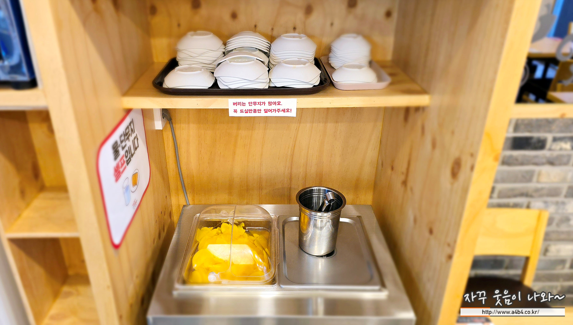 키오스크에서 메뉴 선택하고 주문 하시면 되고요. 물이나 단무지, 그릇, 음식 수령 및 반납도 셀프로 진행됩니다. 셀프이다 보니 오히려 편하게 단무지 무한 흡입 가능한네요. (1떡 1단무지를 선호하는 스타일이어서...)