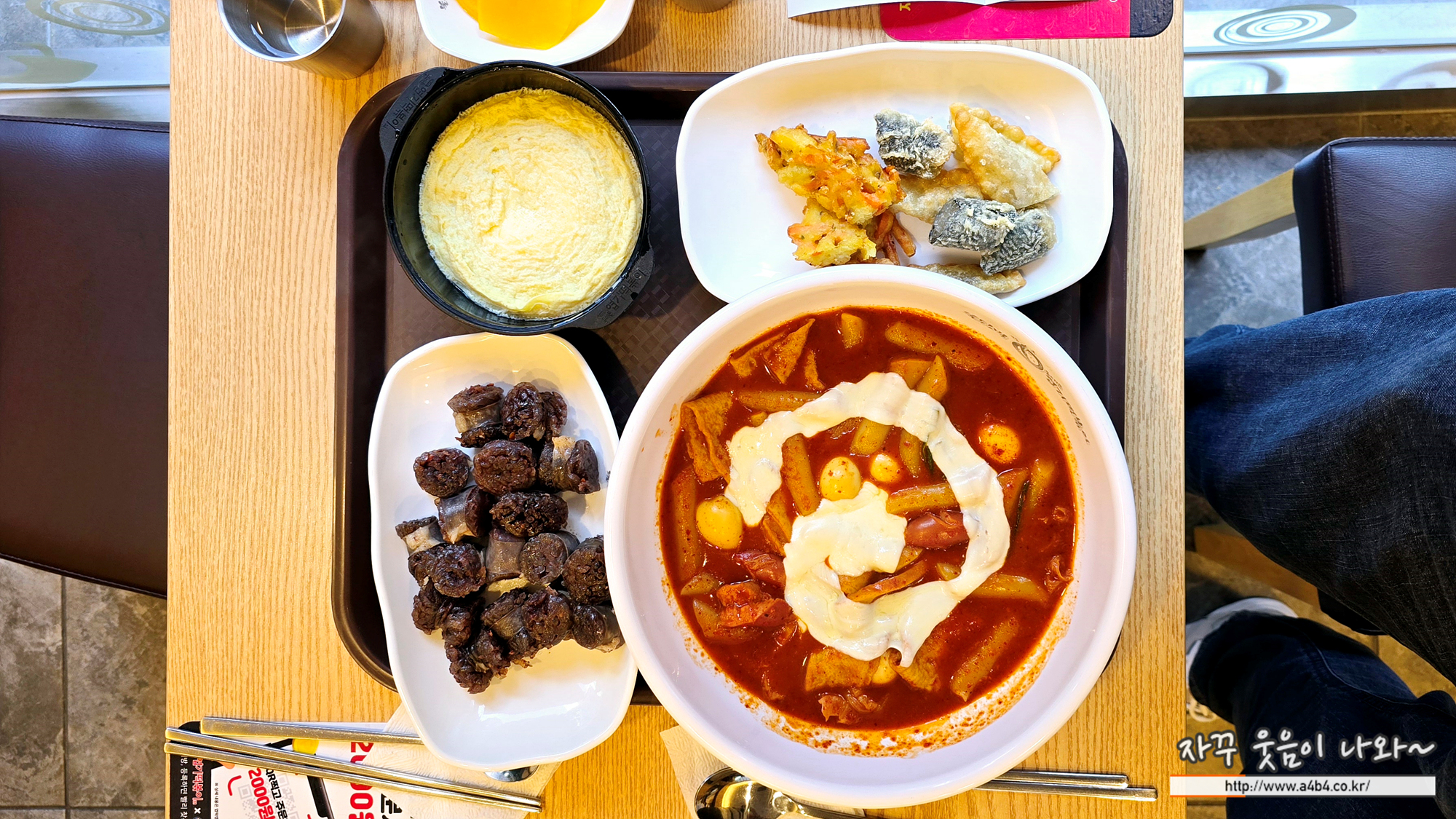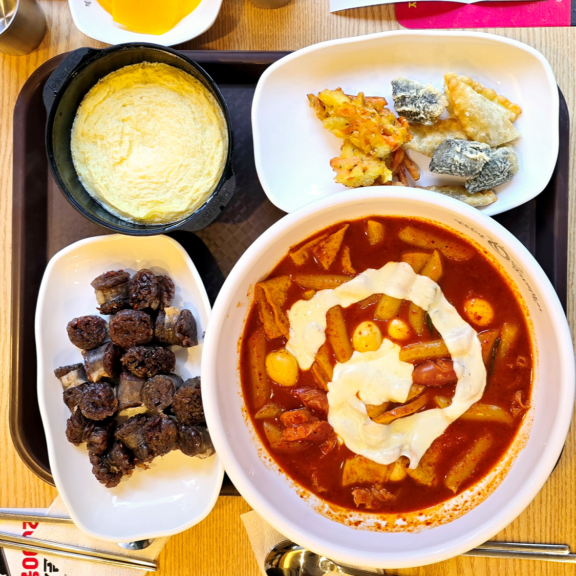 매운맛 단계가가장 약한 착한맛에 메추리알 5개 추가 했습니다. 밀떡에 고추장과 고춧가루가 들어간 떡볶이로 착한맛이라고 하지만 어느정도 맵기는 보장됩니다. (저는 다소 덜 매운, 일행은 딱 좋은 맵기)