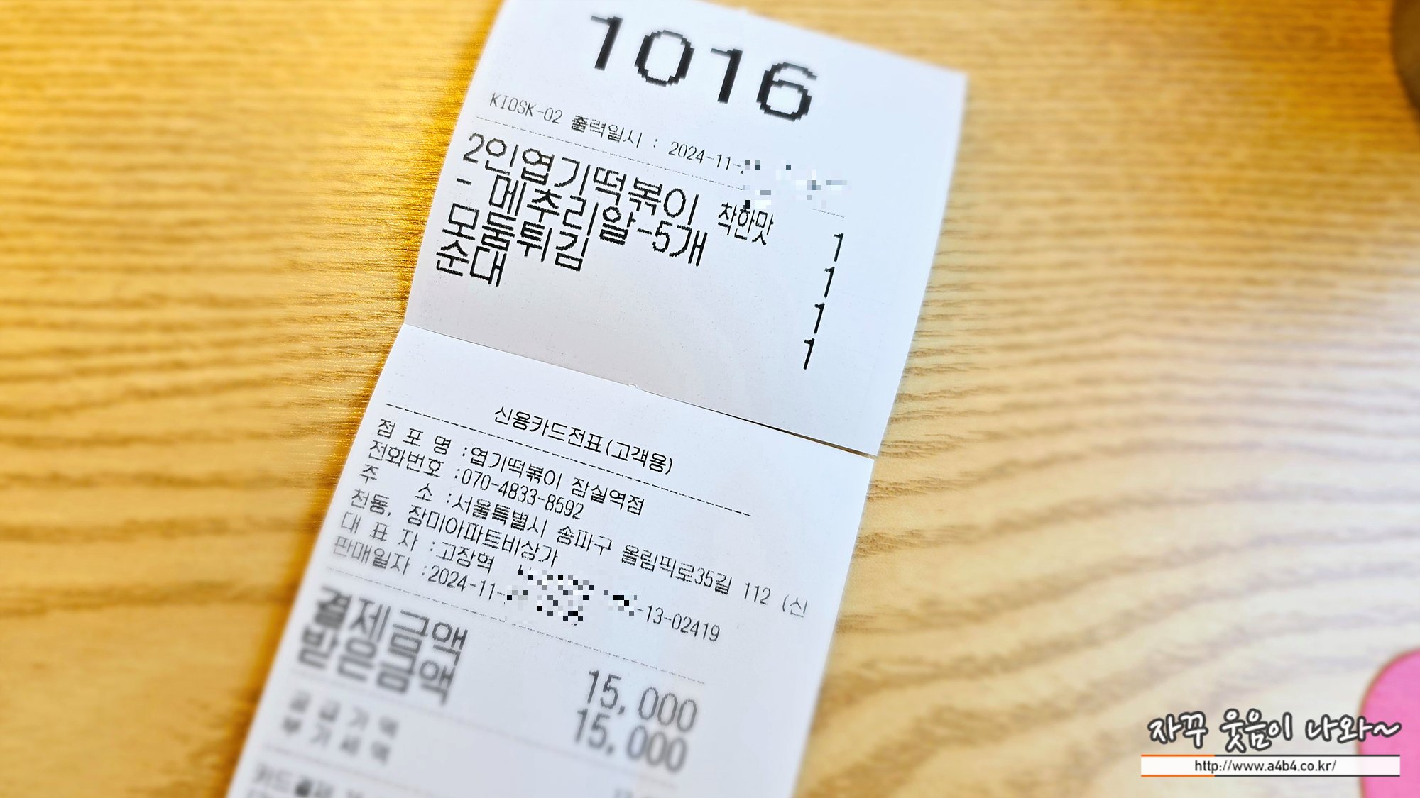 2인 엽기떡볶이, 메추리알, 모둠튀김, 순대 총 15,000원 입니다. 배달보다 훨씬 저렴한 가격인데요.