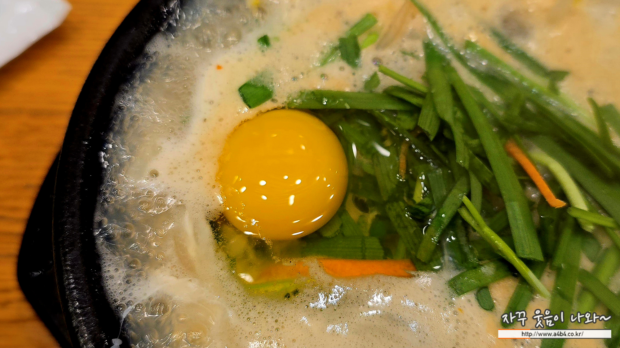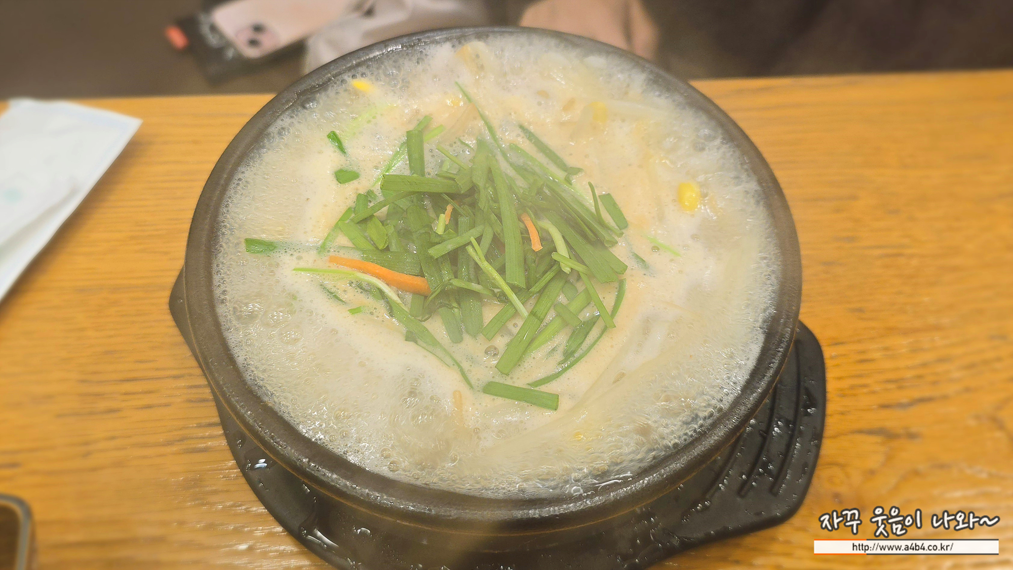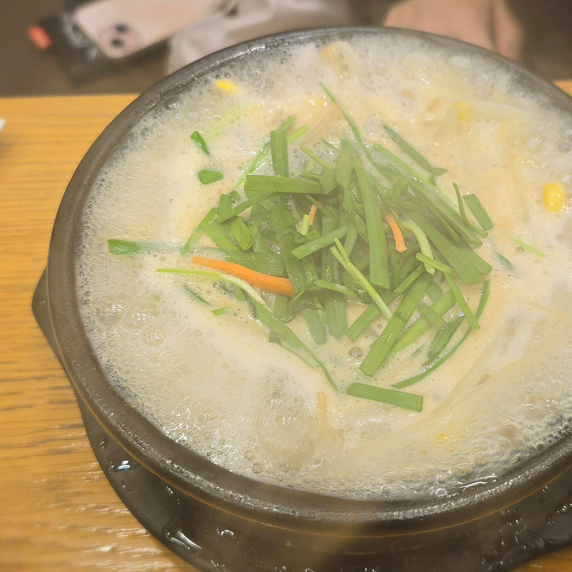 콩나물과 함께 굴과 두부가 들어가고 그 위에 부추가 올라간 굴국밥입니다.