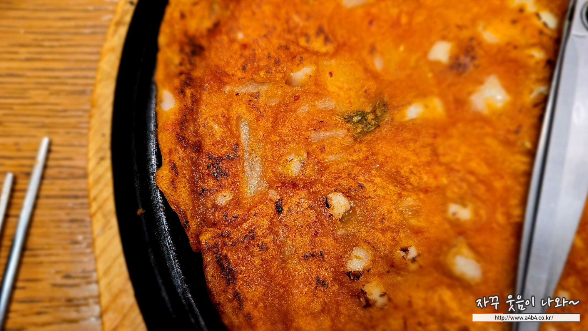부침가루에 김치가 들어간 얇은 두께의 김치전인데요. 정말로 김치와 잘게 자른 (토막낸) 오징어가 들어 있습니다.