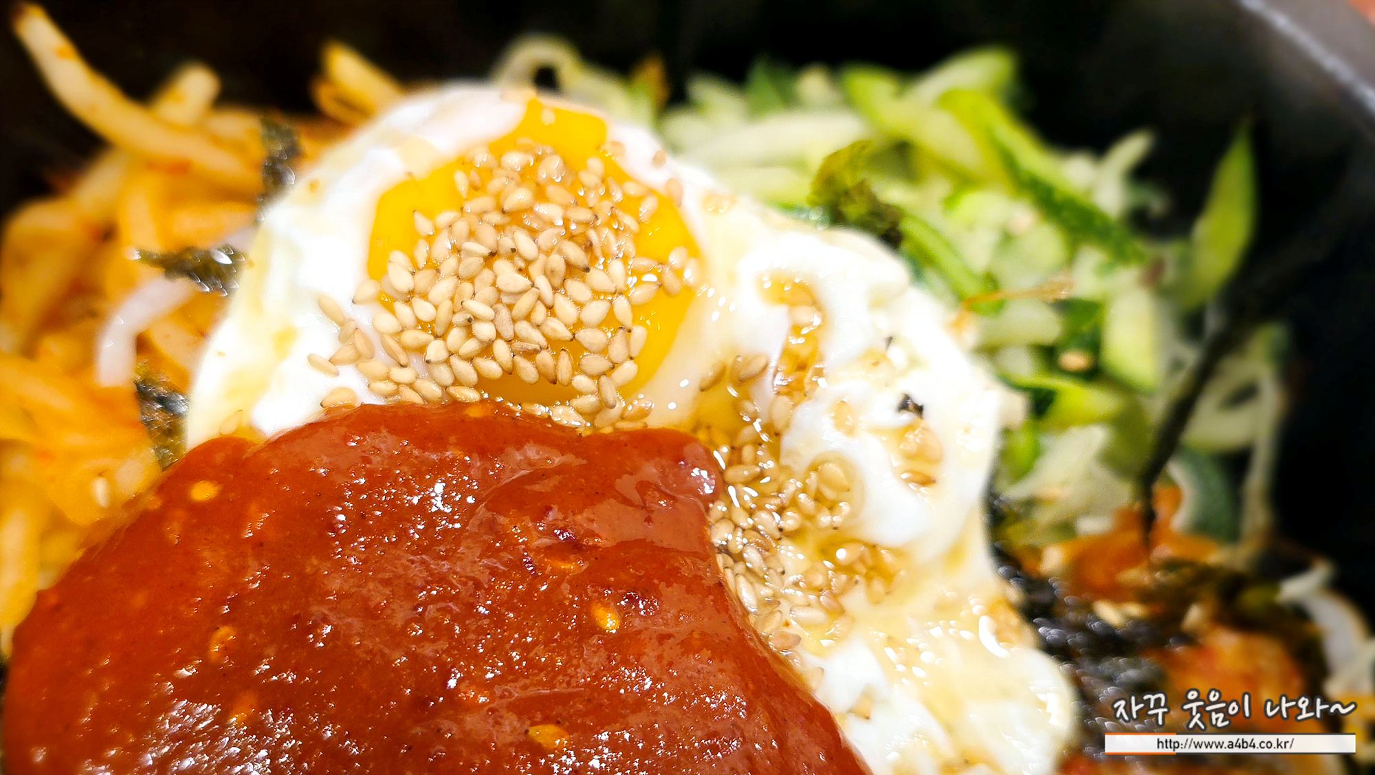 제가 주문한 돌솥비빔밥입니다. 호박, 무채, 콩나물 고사리 등 야채가 다양하게 들어 있네요. 그 위에 계란프라이 하나 올라가 있습니다. 양념 고추장과 참기름 나오고요.