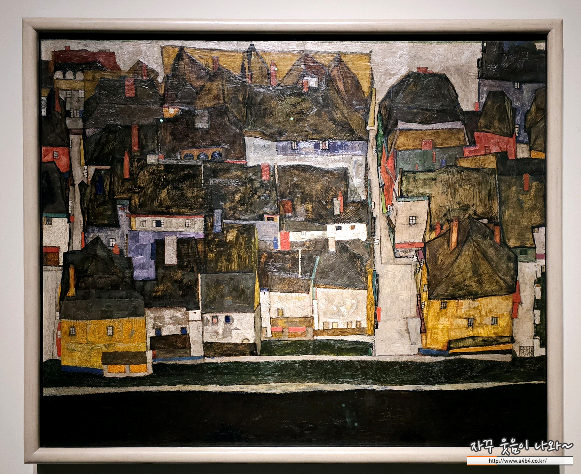 이 작품은 현재 체코의 체스키 크룸로프인 남부 보헤미아 지역의 중세 마을을 그린 것입니다. 실레는 이 지역에 살면서 여러 점의 도시 풍경화를 그렸지만, 마을을 있는 그대로 그리지 않았습니다. 여러 곳에서 본 도시의 모습을 자유롭게 재조합하여 새로운 풍경을 만들어냈습니다. 이 도시에서 머물며 느낀 소외감을 생명력을 잃은 죽은 도시처럼 검은색으로 그려낸 실레만의 표현법이 돋보입니다.