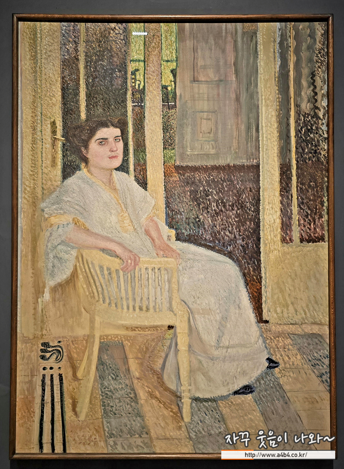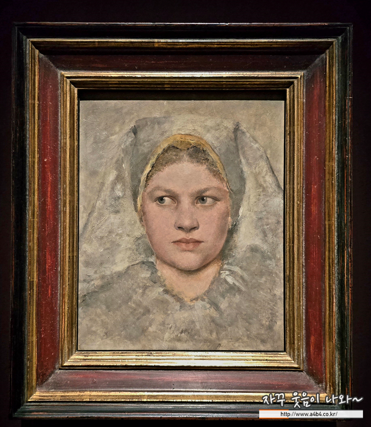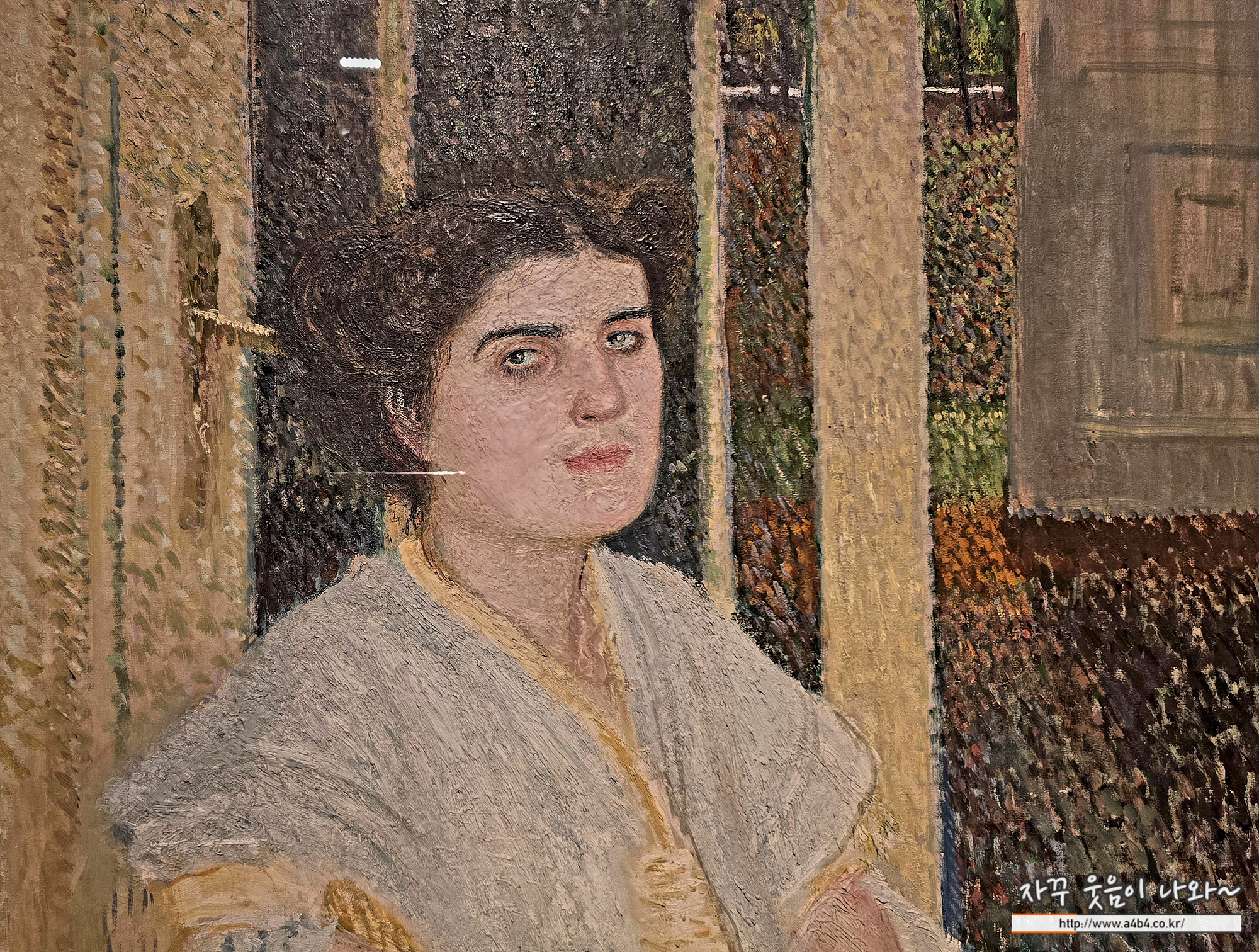 세련된 모자를 쓰고 풍성한 소매가 돋보이는 블라우스를 입은 초상화 속 여인이 우리를 바라보고 있습니다. 두터운 물감으로 그려낸 수풀과 여인의 블라우스 소매는 손으로 만지지 않아도 질감이 생생하게 느껴지는 것 같아요.