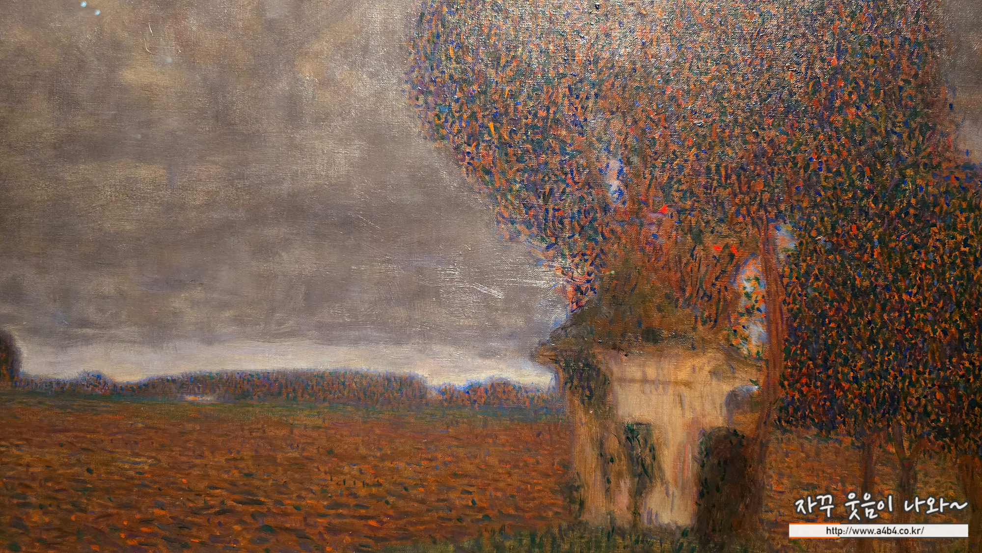 클림트의 풍경화에서 거대한 포플러나무는 작품의 오른편을 가득 채우고 있죠. 나무를 잘 보시면 여러 가지 색 물감을 찍어서 반짝이는 효과를 냈습니다.어떤 평론가는 이것을 '마치 송어의 비늘 같다'고 말했어요. 멀리 펼쳐진 들판 너머로 하늘이 크게 그려져 있는데, 바람이 소용돌이치듯이 불고 먹구름이 져 금방이라도 폭풍우가 쏟아질 것 같네요. 하늘을 극적이고 생생하게 그렸던 화가가 한 명 떠오르지 않나요? 바로 빈센트 반 고흐의 영향을 받은 것입니다. 클림트도 유럽에서 유행했던 인상주의의 영향을 받았다는 것을 알 수 있어요. 당시에는 일반적이지 않은 정사각형 화폭을 선택한 것도 참 클림트답다는 생각이 듭니다