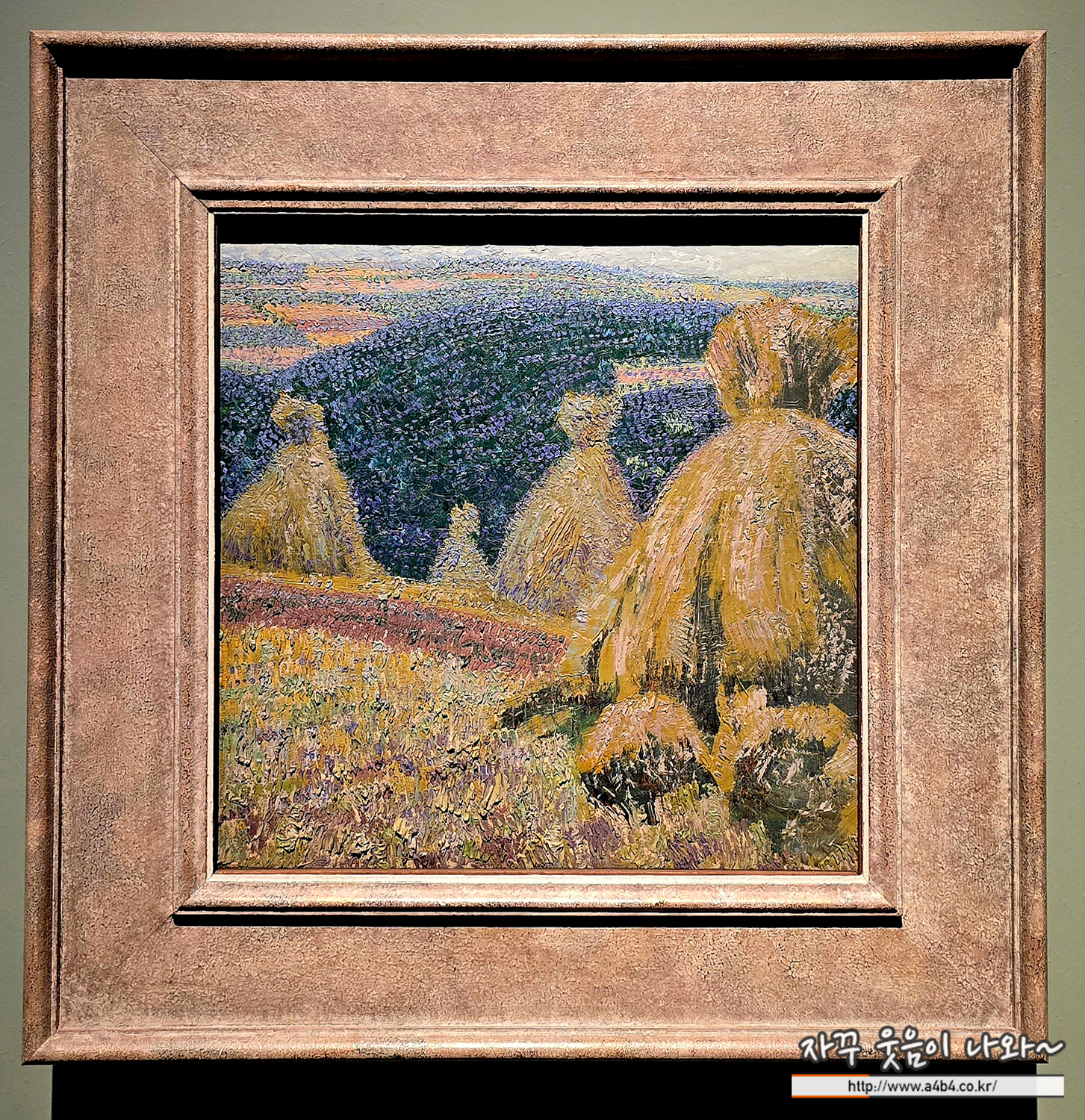 넓게 펼쳐진 들판과 언덕을 표현한 이 그림은 레오폴트 블라우엔슈타이너의 초기 작품이다. 높이 쌓아 올린 옥수수 짚을 여러 곳에 배치해 화면을 구성했고, 가까운 곳과 먼 곳의 풍경을 조화롭게 표현했다. 당시 흔했던 황토색 옥수수 짚을 소재로 수확 이후 여름날 풍경을 묘사했다. 일본 목판화와 인상주의 회화에 관심이 많았던 그는 구도와 색을 실험적으로 사용하고 그 결과를 작품에 충실히 반영했다.