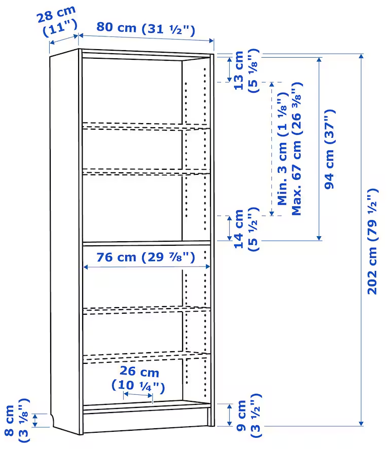 이케아 빌리 6단 책장 사이즈는 아래와 같습니다. 높이 202cm, 폭 80cm, 깊이 26cm로 큰 책도 무난하게 수납이 가능합니다.