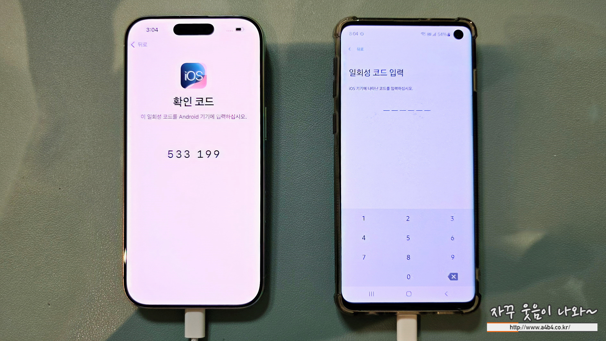 먼저 안드로이드 폰에서 iOS로 이동앱을 활성화 시키고 두 기기를 데이터 케이블로 열결해 줍니다.