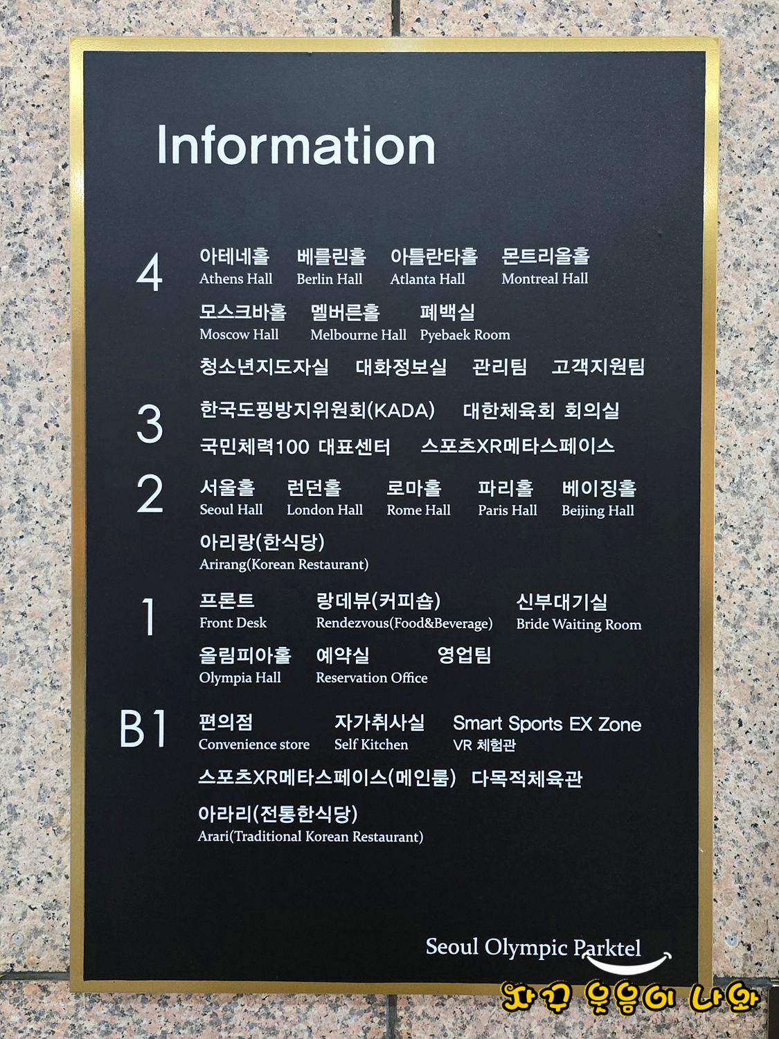 주차 후 올림픽파크텔 건물로 들어오시면 되고요. 계단이나 엘리베이터를 이용하셔서 지하 1층으로 내려오시면 됩니다. 아래 사진이 올림픽공원 한정식 맛집인 아라리 입구입니다.