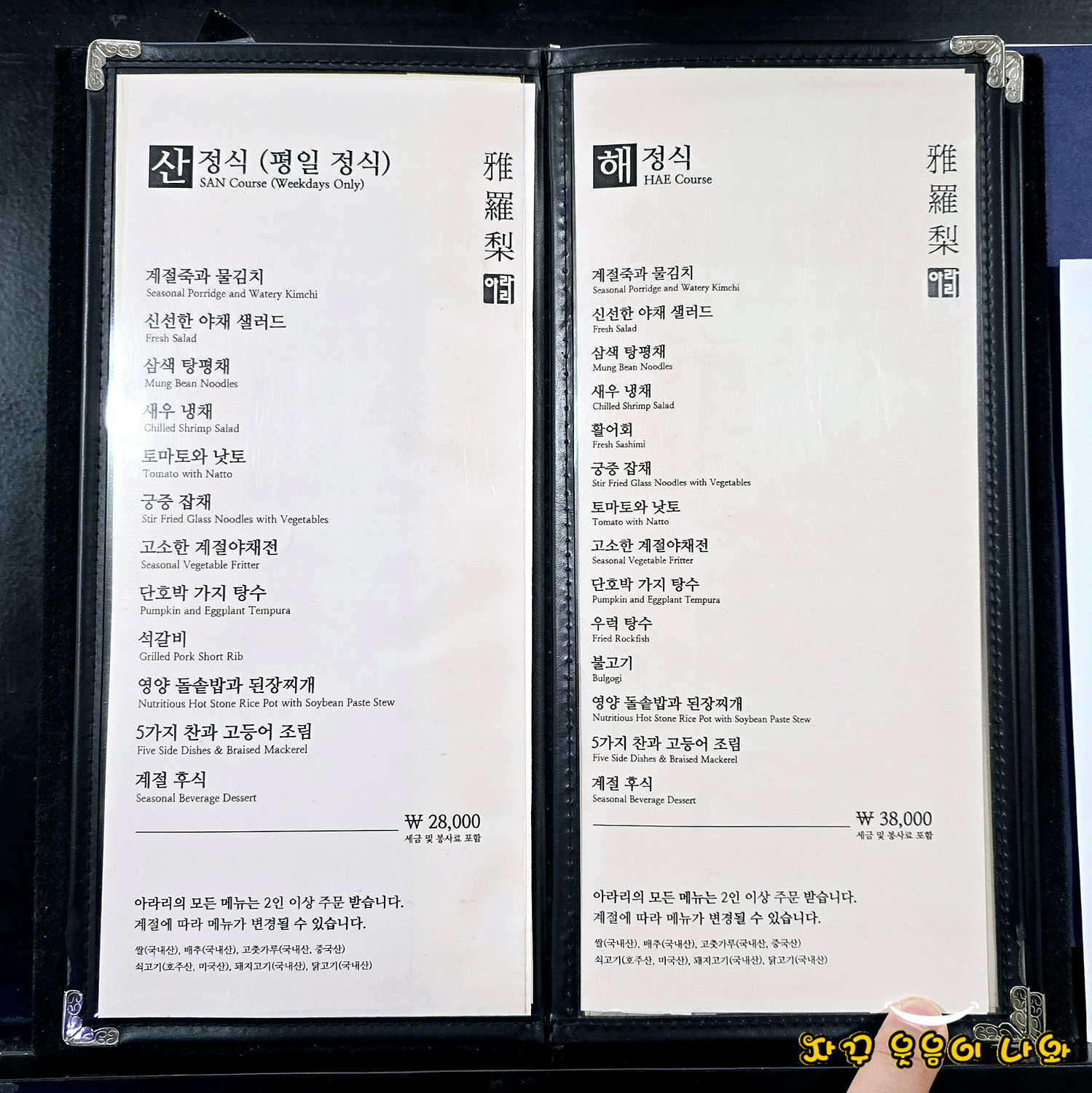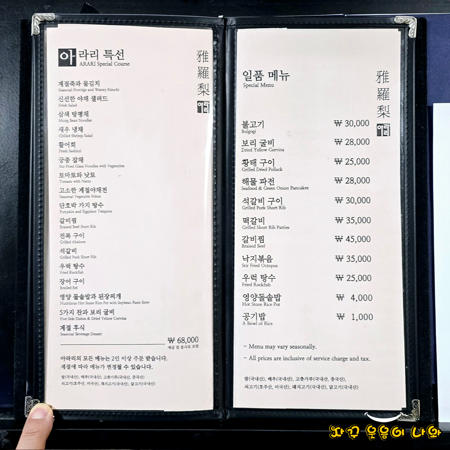 | 한정식 아라리 메뉴 및 가격