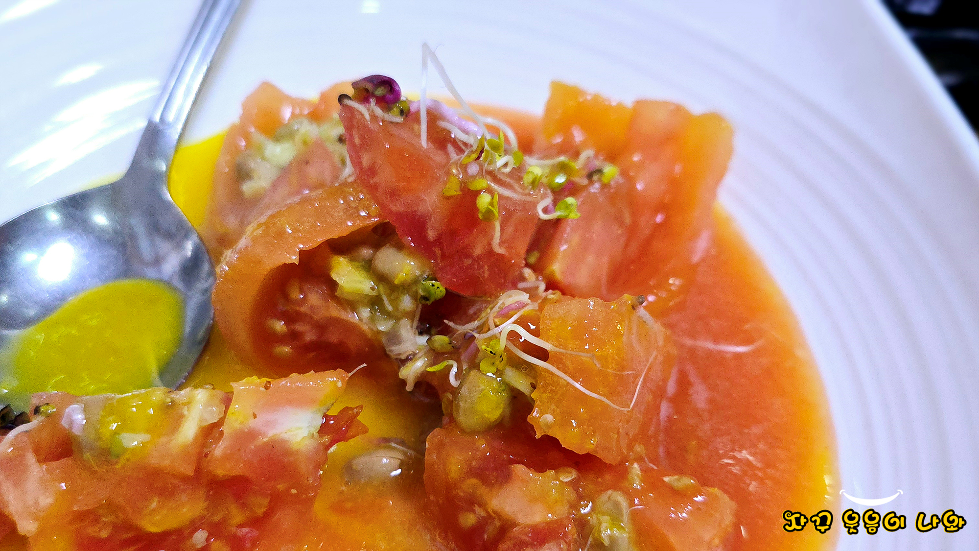 토마토와 낫토는 껍질을 벗기 토마토에 상큼한 맛의 낫토소스가 올려진 메뉴입니다. 가위로 먹기 편하게 잘라 주시는데요. 이름과는 다르게 달콤 상큼한 맛을 보입니다. 유자? 소스맛이 더 강한... 입맛 돋구기 좋은...