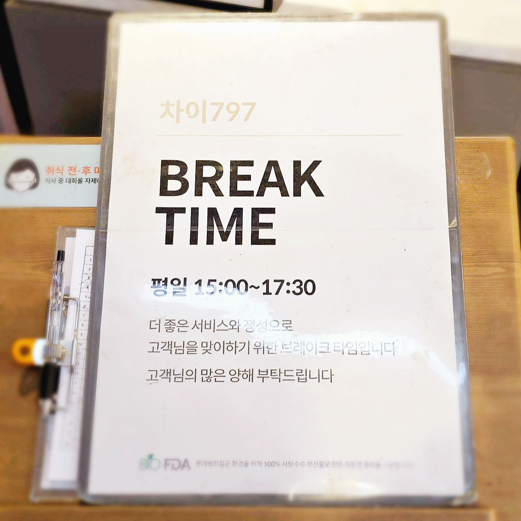 영업시간은 월~금 11:30~21:30분, 토일 12:00~21:30분입니다. 차이 797 브레이크타임은 평일 15:00~17:30분 진행되며 라스트오더는 14:00, 20:30분입니다.