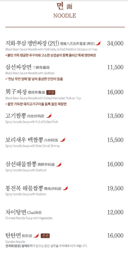 메뉴판은 위 사진과 같습니다. 짜장면이나 짬뽕, 탕면 등의 면류와 볶음밥, 잡채밥 등의 밥류, 그리고 소룡포, 쇼마이 등의 수제딤섬이 준비되어 있습니다. 이외에도 탕수육, 유린기, 깐풍기 등의 요리도 맛보실 수 있습니다.