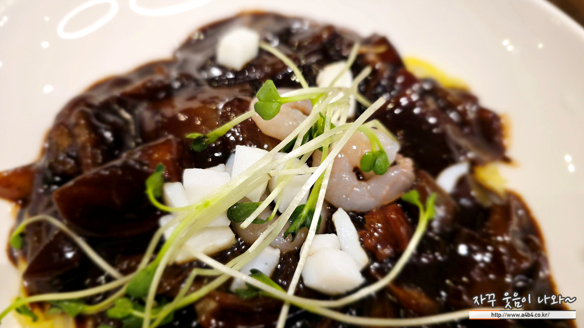 큼직한 양파가 듬쁙들어 있고요. 그 위에 새우와 오징어가 올라간 해물짬뽕입니다. 보기만해도 입맛들 돋구는...
