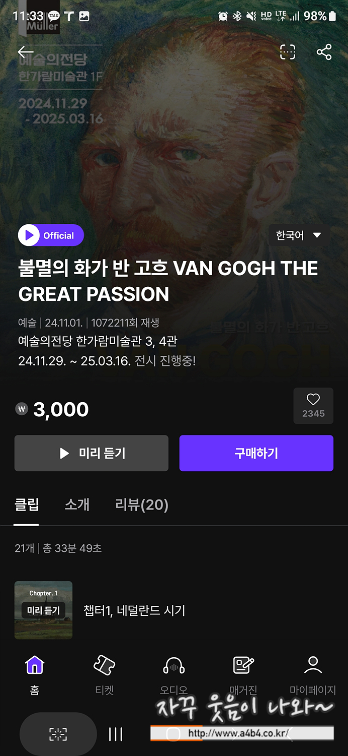 오디오 가이드는 큐피커 앱을 통해 3,000원 유료로 이용이 가능합니다만, 작품 15개 정도 설명이 들어 있네요. 이번 불멸의 화가 반 고흐 오디오가이드도 다른 전시회 오디오 가이드에 비해 부실하다는 생각입니다.