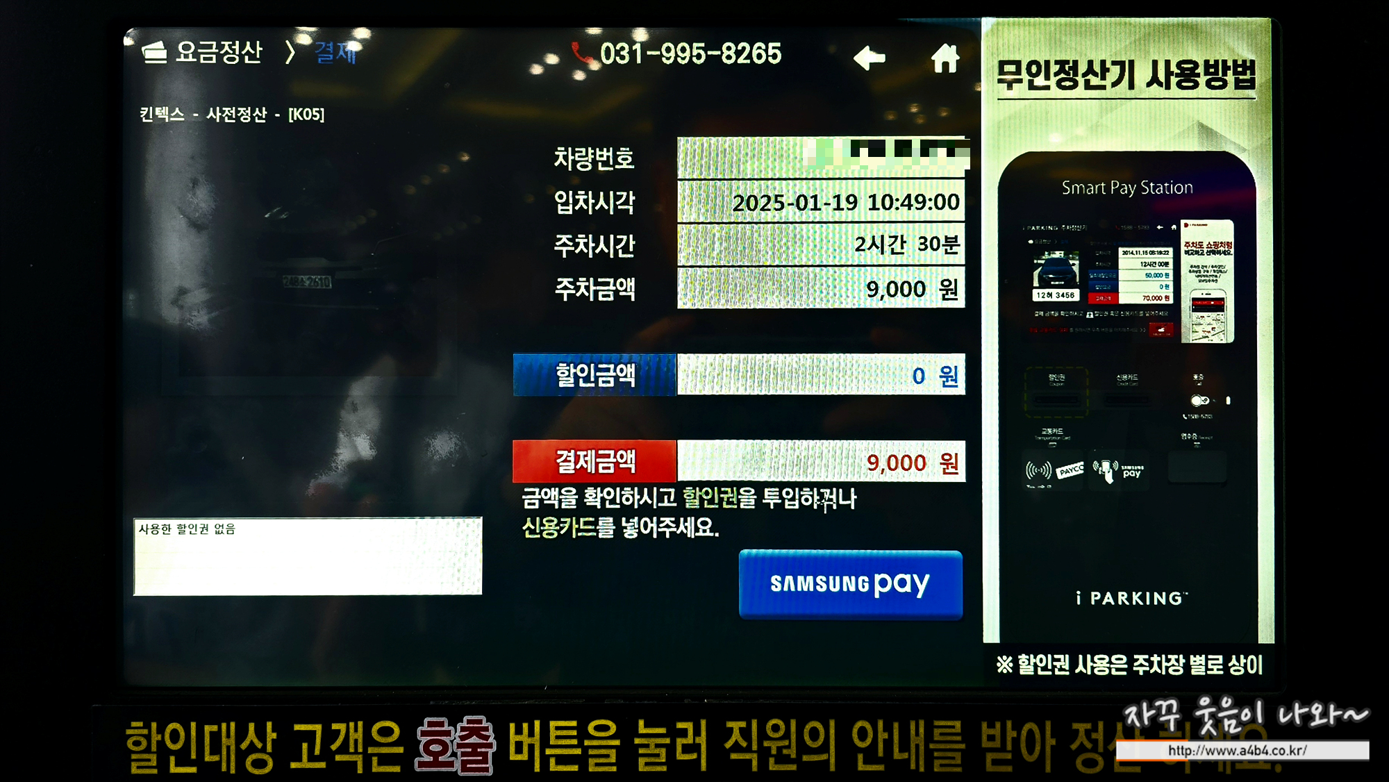 저는 하이브리드 차량으로 50% 할인받아 4,500원에 주차정산 했습니다. 신용카드 및 삼성페이 정산 가능. 킨텍스 주차요금 애플페이는 지원하지 않습니다.