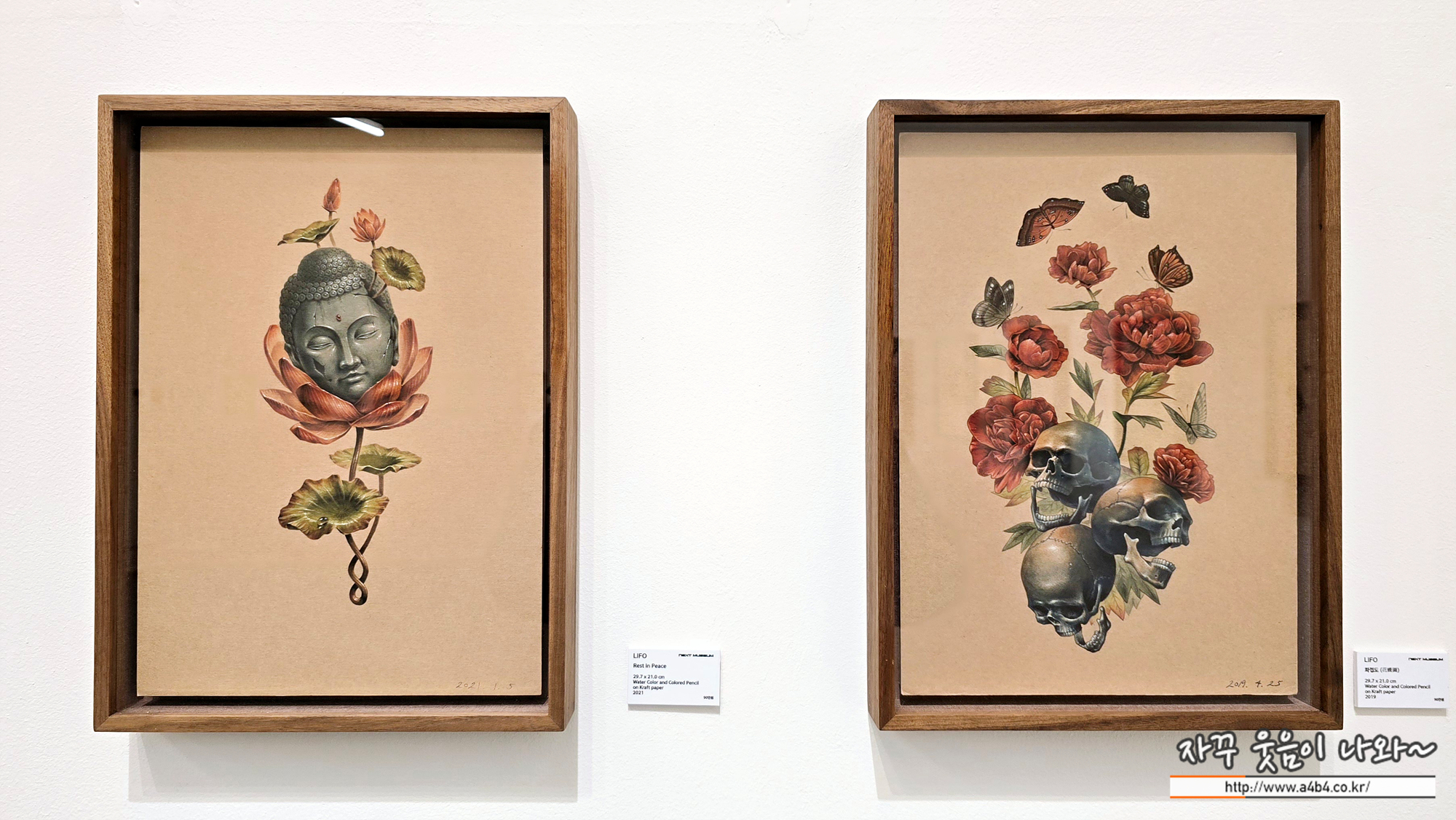 이번 넥스트뮤지엄 리포 개인전에 전시된 작품의 대부분은 A4 사이즈의 크라프트지에 작업한 작품이 대부분입니다. 타투이스트인 작가는 그의 타투 작품을 이곳에 옮겨 전시한다는 느낌을 주네요.