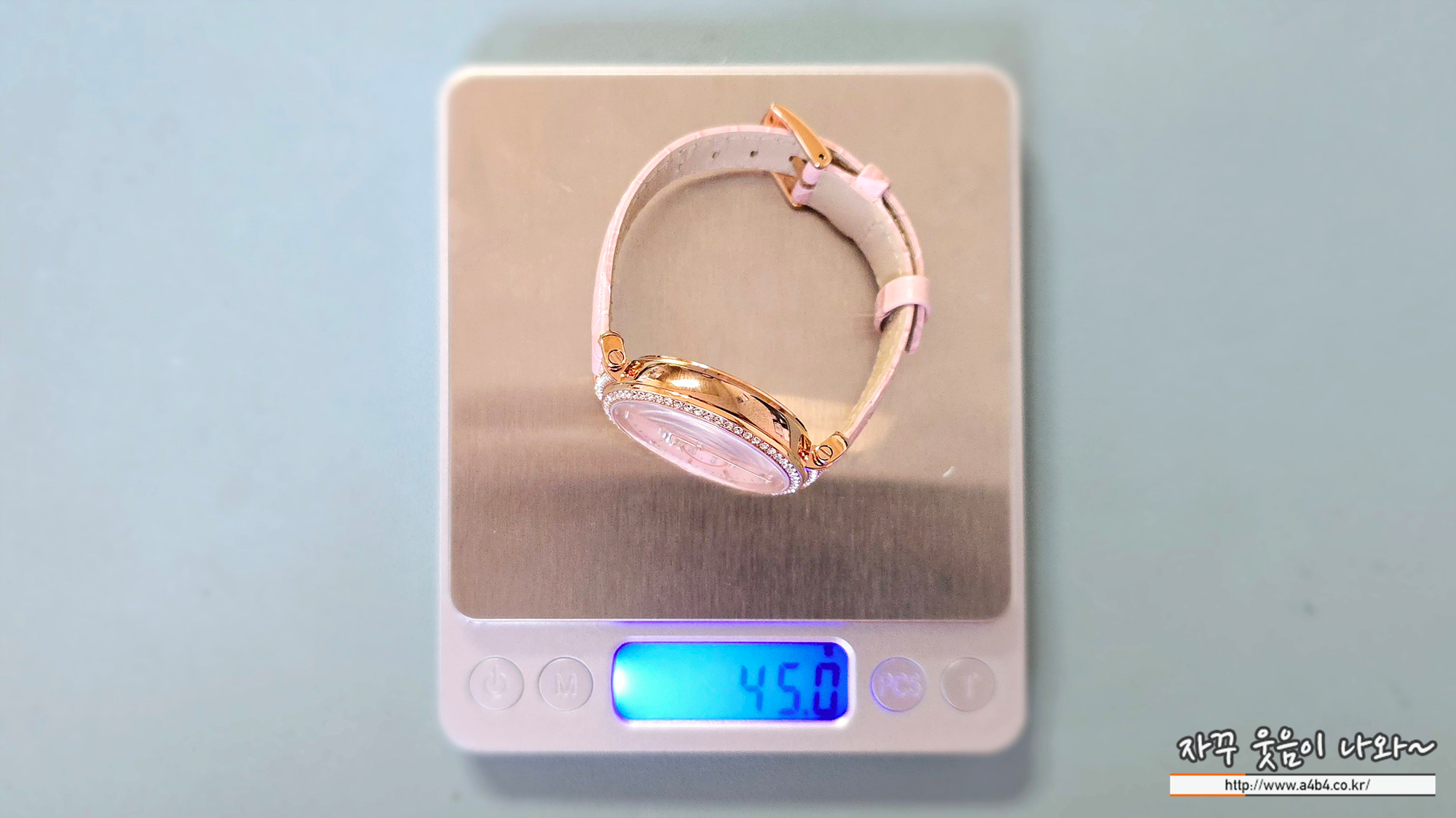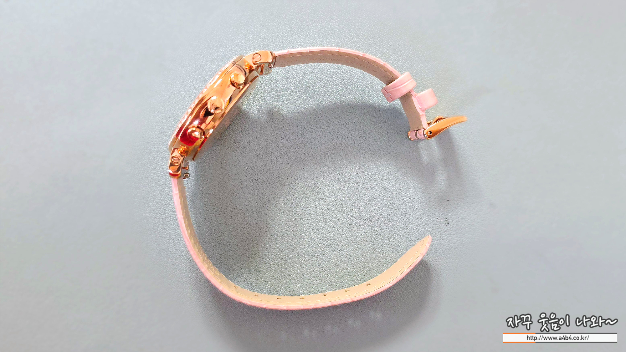 재질은 모던한 로즈 골드 톤 PVD 코팅 스테인리스 스틸 케이스에 핑크 자개 다이얼을 더한 다소 화려한 모양을 보여주네요.