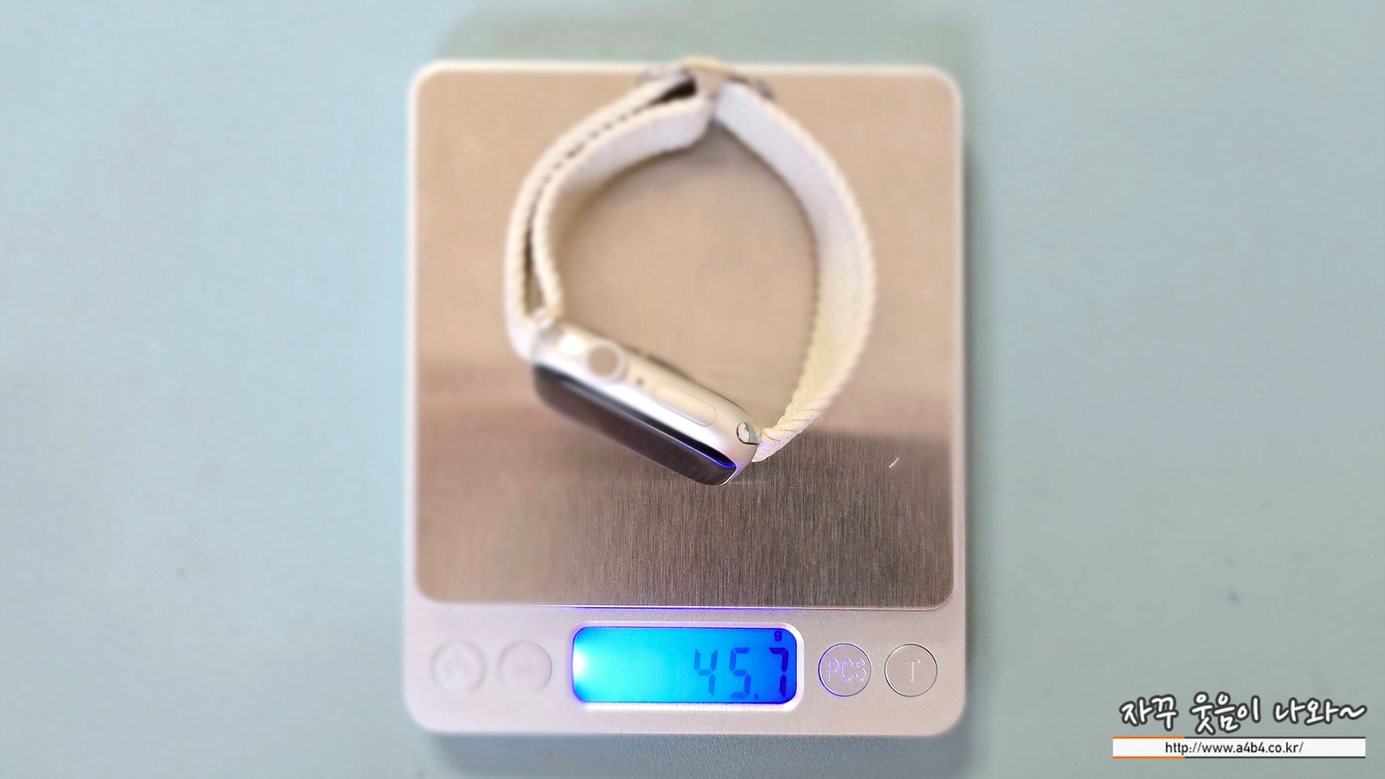 시계 중량은 스와브로스키 시계 #5580352이 45.0g, 애플워치7은 45.7g으로 무게 차이는 거의 없습니다.