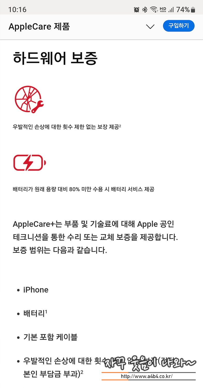 이번에 블로그 글을 보니 몇 십만원 수리비 운운은 아마도 애플케어플러스 미가입 폰의 경우로 생각되고, 다소 과장된 금액을 말하는 것 같다는... 제발 블로그 광고글은 제목 앞에 광고 표시를 의무화 해야 한다.