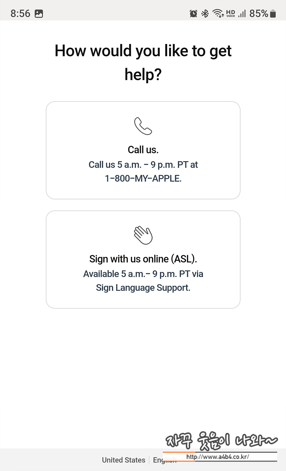 아이폰 수리 예약하고 받은 문자, 황당하게도 링크를 클릭하면 아이폰 영문 페이지로 이동한다.