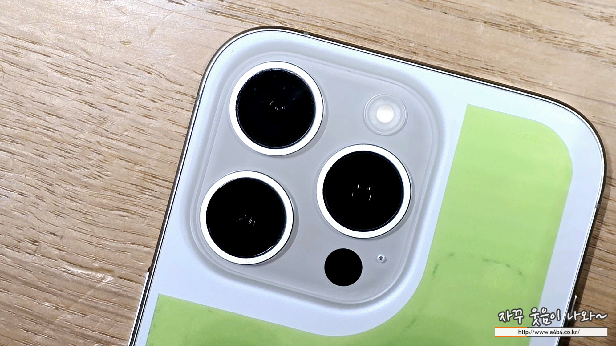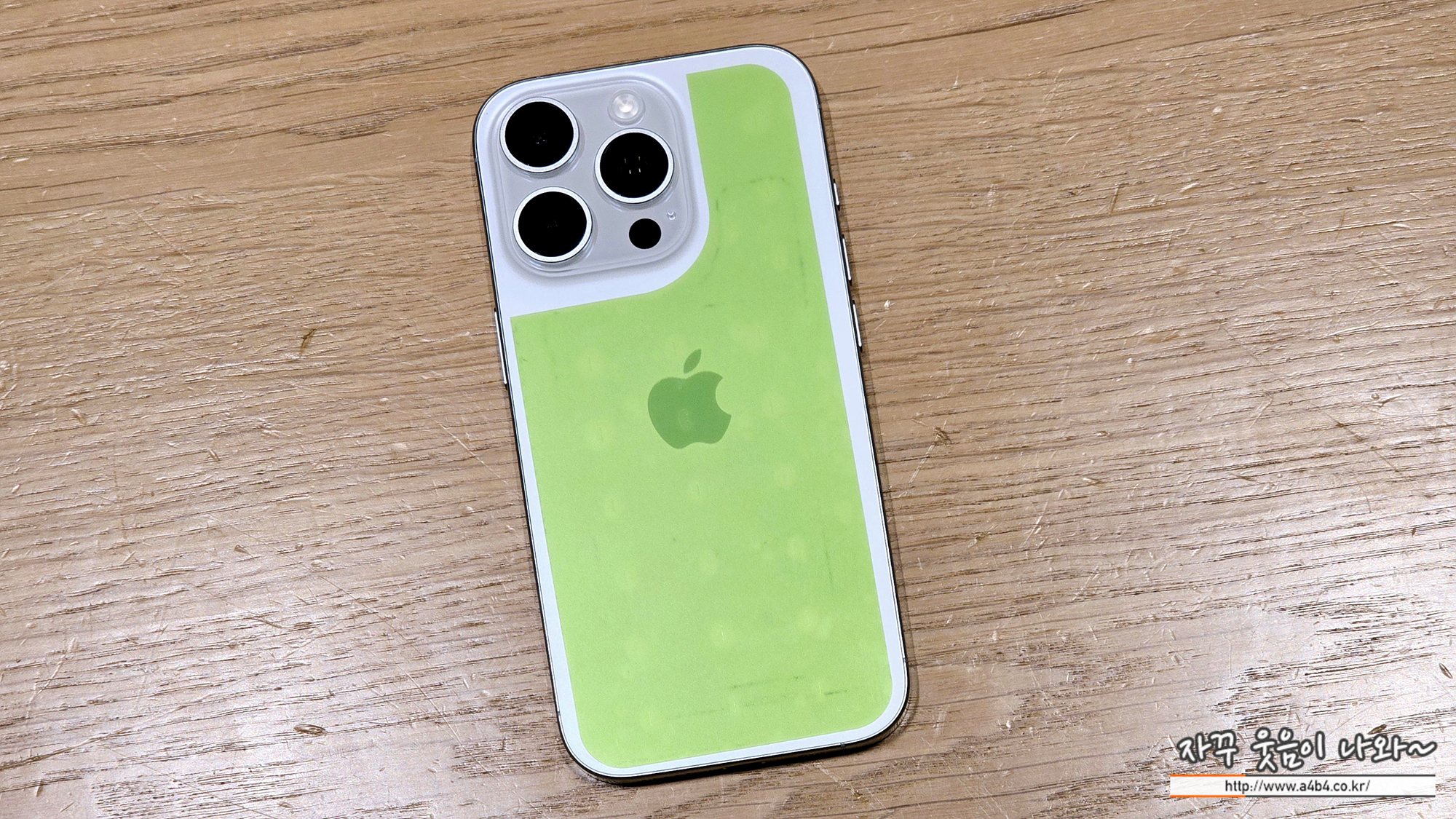 초록색 보호필름이 부착된 아이폰 16프로. 파손되었던 카메라 유리가 깔끔하게 수리되었다.