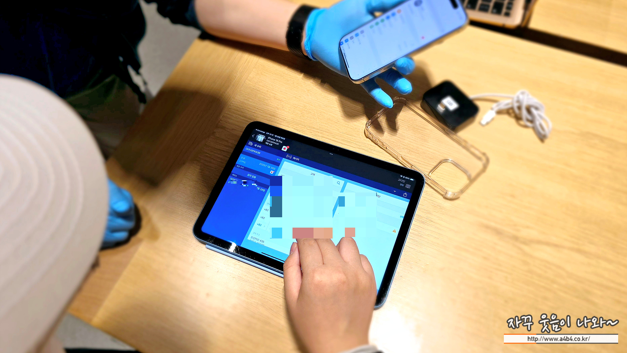 14:20분 부터 직원분과 아이폰 뒷판 파손 수리위한 검수 및 접수절차 진행. 과거 접수 및 진행이력 확인과 본인확인 진행하고. 수리 진행할 아이폰 사진 몇 장 촬영 (전면, 충전단자, 파손부위 중심으로)