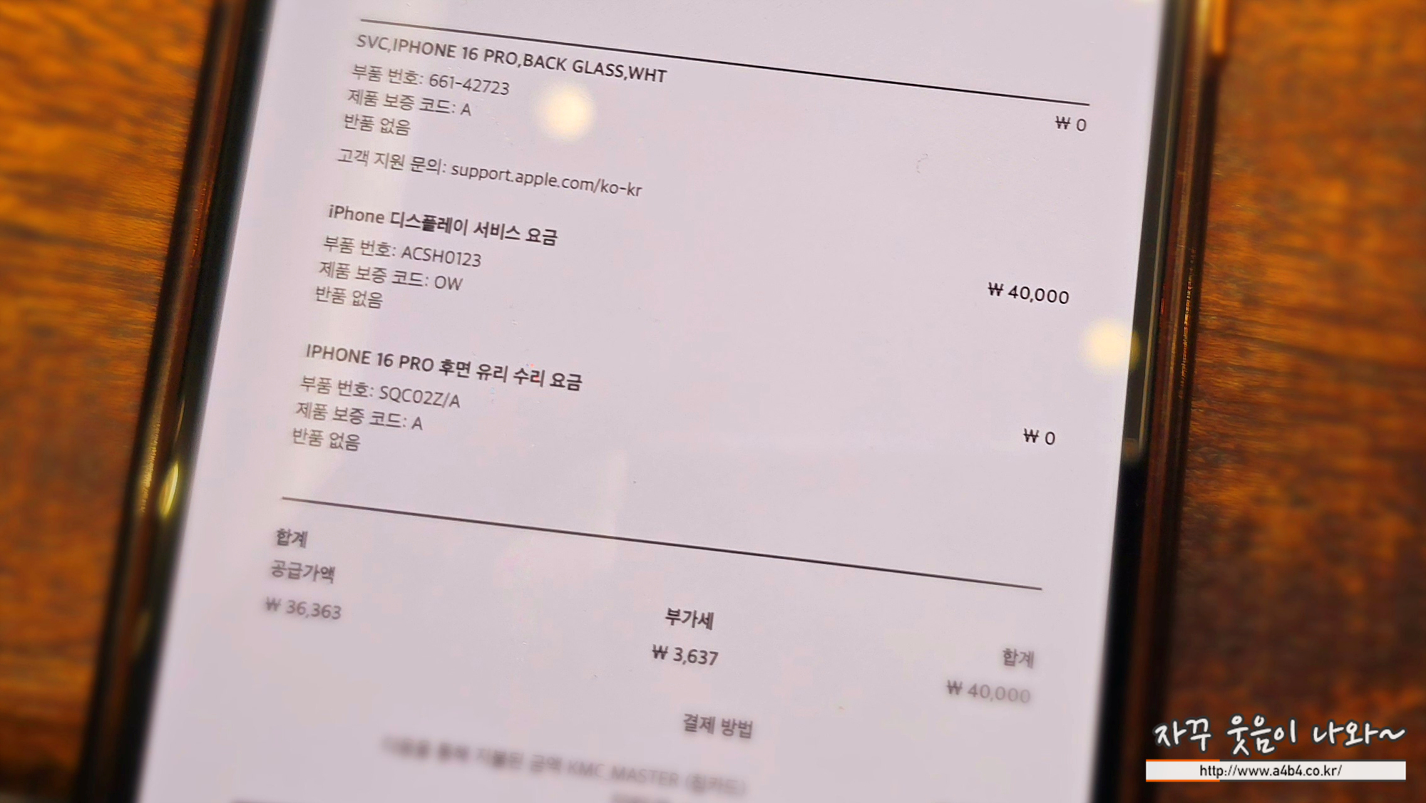 수리내역은 아이폰 디스플레이 서비스 요금으로 40,000원, 아이폰 16 프로 후면 유리 수리요금은 0원처리되어 있다.